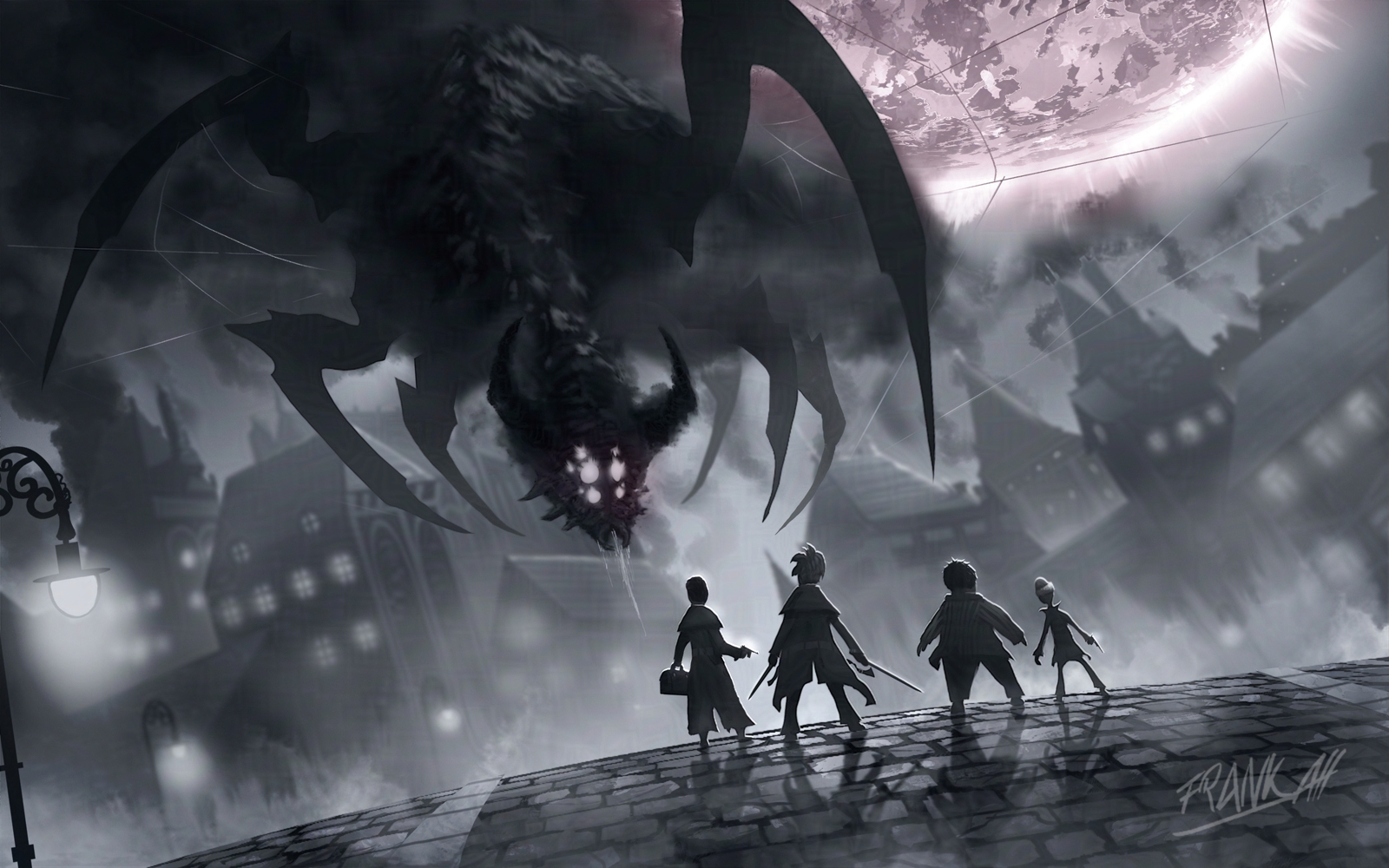 4boys artist_name bag city claws coat earl_d_wilson eldritch_abomination francois_guillaume_de_tesseraque frankatt german_commentary glowing glowing_eyes graf_mon greyscale gun highres holding holding_bag holding_gun holding_weapon horns house lamppost lord_henry_grey monochrome monster moon morriton_manor multiple_boys night outdoors standing weapon
