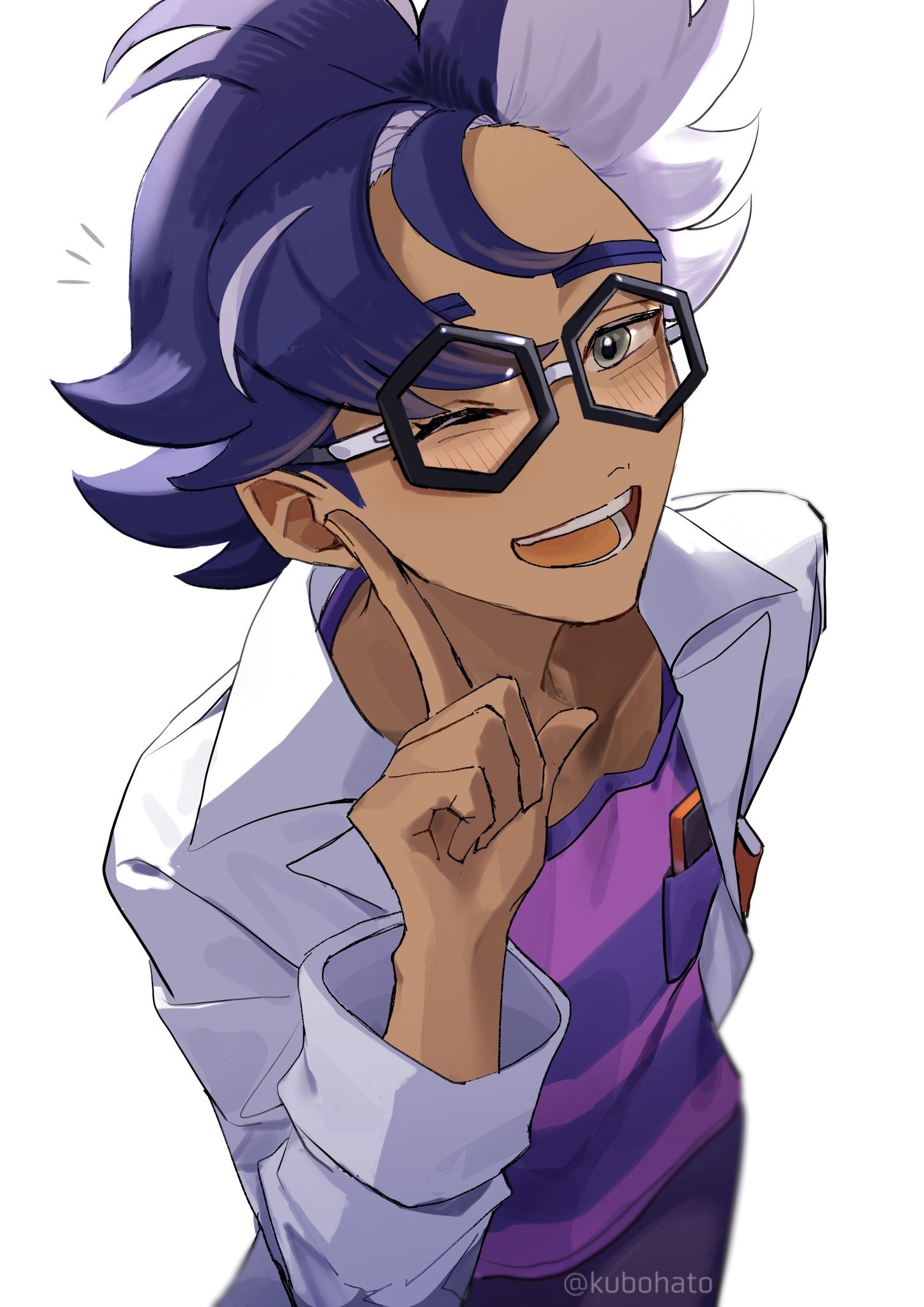 1boy ;d black-framed_eyewear blurry blush coat commentary_request glasses hand_up happy highres index_finger_raised jacq_(pokemon) kubota_hato male_focus multicolored_hair nintendo notice_lines one_eye_closed open_clothes open_coat open_mouth pokemon pokemon_sv purple_shirt shirt simple_background smile solo striped_clothes striped_shirt teeth twitter_username two-tone_hair watermark white_background white_coat