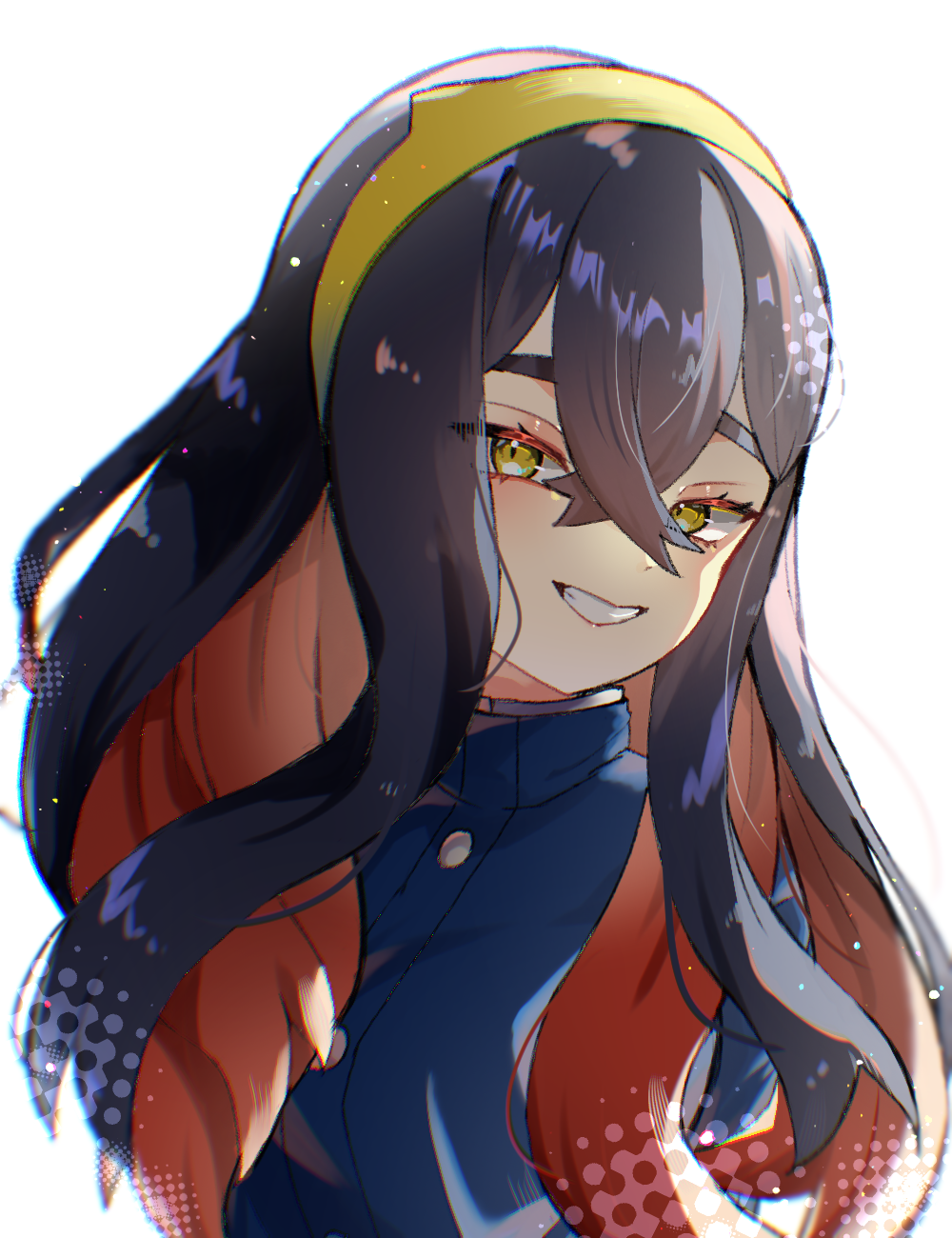 1girl black_hair blue_jacket buttons carmine_(pokemon) commentary_request crossed_bangs eyelashes grin hair_between_eyes hairband highres jacket long_hair looking_at_viewer multicolored_hair nintendo pokemon pokemon_scarlet_and_violet red_hair rosyehosii simple_background smile solo teeth two-tone_hair upper_body white_background yellow_eyes yellow_hairband