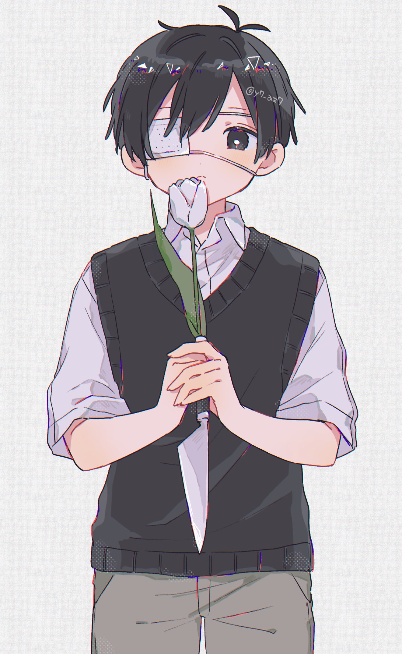 1boy antenna_hair black_eyes black_hair black_sweater_vest bright_pupils brown_shorts commentary cowboy_shot double-parted_bangs eyepatch flower grey_background hair_between_eyes halftone highres holding holding_flower holding_knife kitchen_knife knife looking_at_viewer male_focus omori shirt short_hair short_sleeves shorts simple_background solo spoilers straight-on sunny_(omori) sweater_vest untranslatable_commentary tulip twitter_username white_flower white_pupils white_shirt white_tulip yayoripain