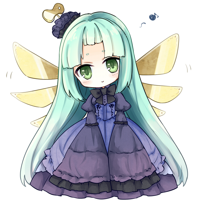 1girl atelier_(series) atelier_ayesha blue_hair blue_hat chibi closed_mouth commentary_request dress frilled_dress frills full_body green_eyes hat juliet_sleeves long_hair long_sleeves looking_at_viewer musical_note odelia_(atelier) puffy_sleeves purple_dress simple_background smile solo standing tilted_headwear very_long_hair white_background winding_key wings yuya_(night_lily)