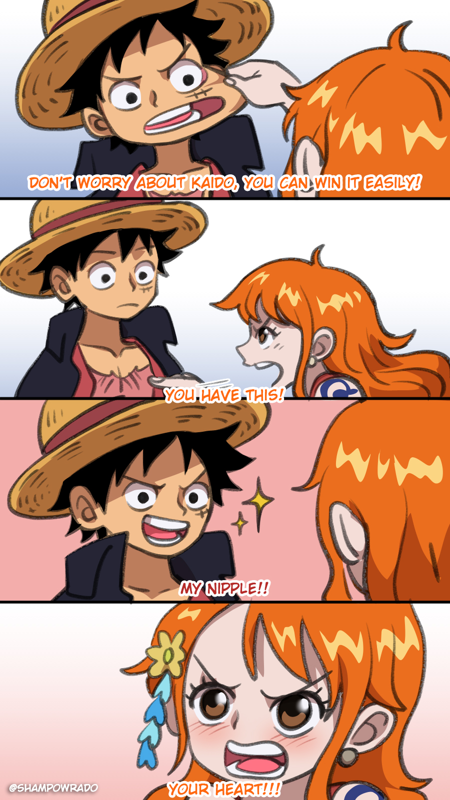 1boy 1girl bare_shoulders black_coat black_hair blush brown_hair cheek_pinching coat coat_on_shoulders collarbone commentary earrings english_commentary english_text facial_scar gradient_background hair_ornament hat highres japanese_clothes jewelry kimono long_hair looking_at_another monkey_d._luffy nami_(one_piece) nami_(one_piece)_(onigashima) official_alternate_costume one_piece open_clothes open_mouth open_shirt orange_hair pearl_earrings pectorals pinching pointing red_kimono red_shirt scar scar_on_cheek scar_on_chest scar_on_face shampowrado shirt short_hair shoulder_tattoo sleeveless sleeveless_kimono sparkle straw_hat tattoo twitter_username upper_body wavy_hair