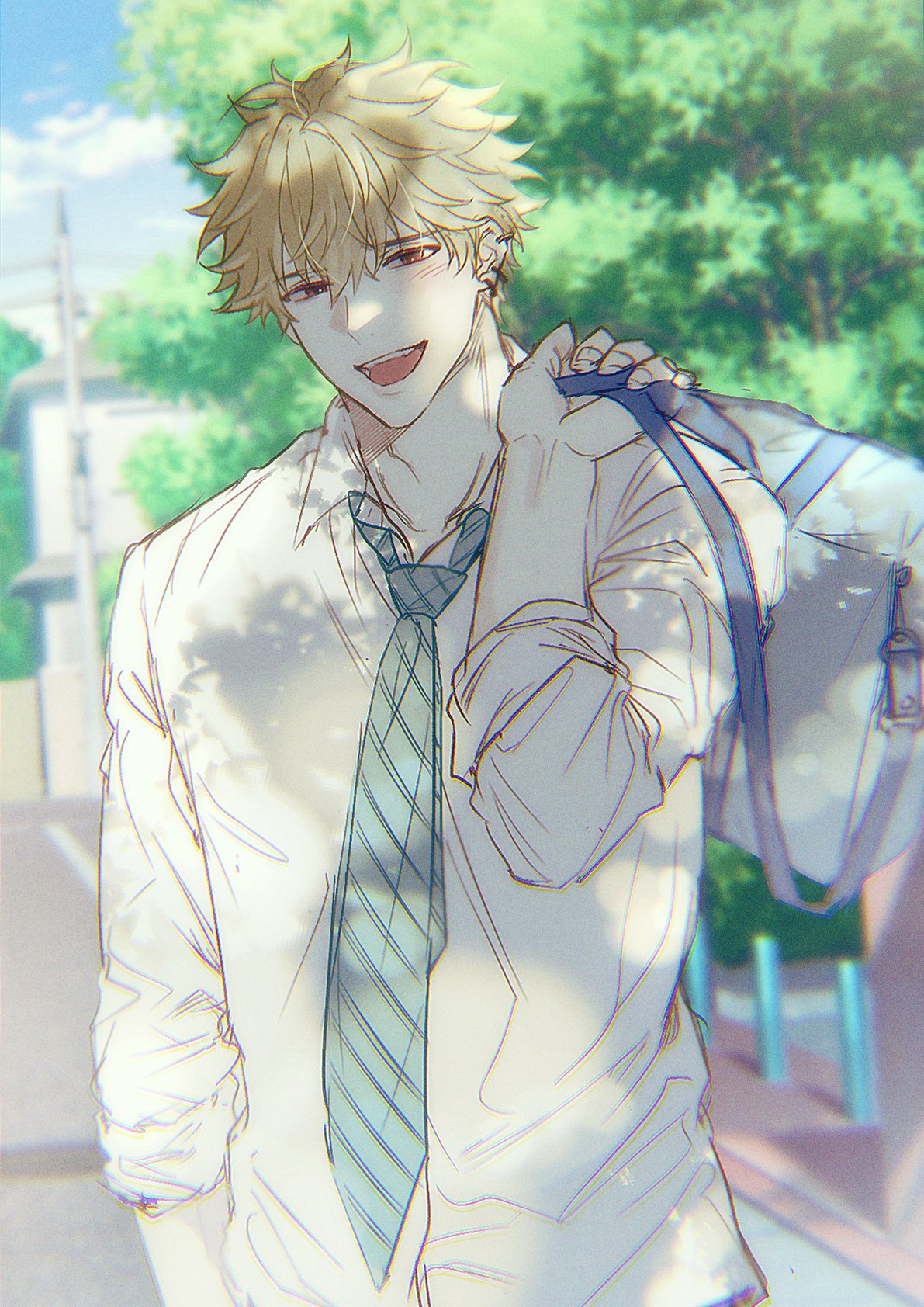 1boy :d blue_necktie blue_sky brown_hair cloud collared_shirt given green_hair highres house long_sleeves looking_at_viewer male_focus mi_muuuu necktie open_mouth outdoors shirt sky smile solo street_fighter teeth tree upper_body white_shirt yoshida_yuki_(given)