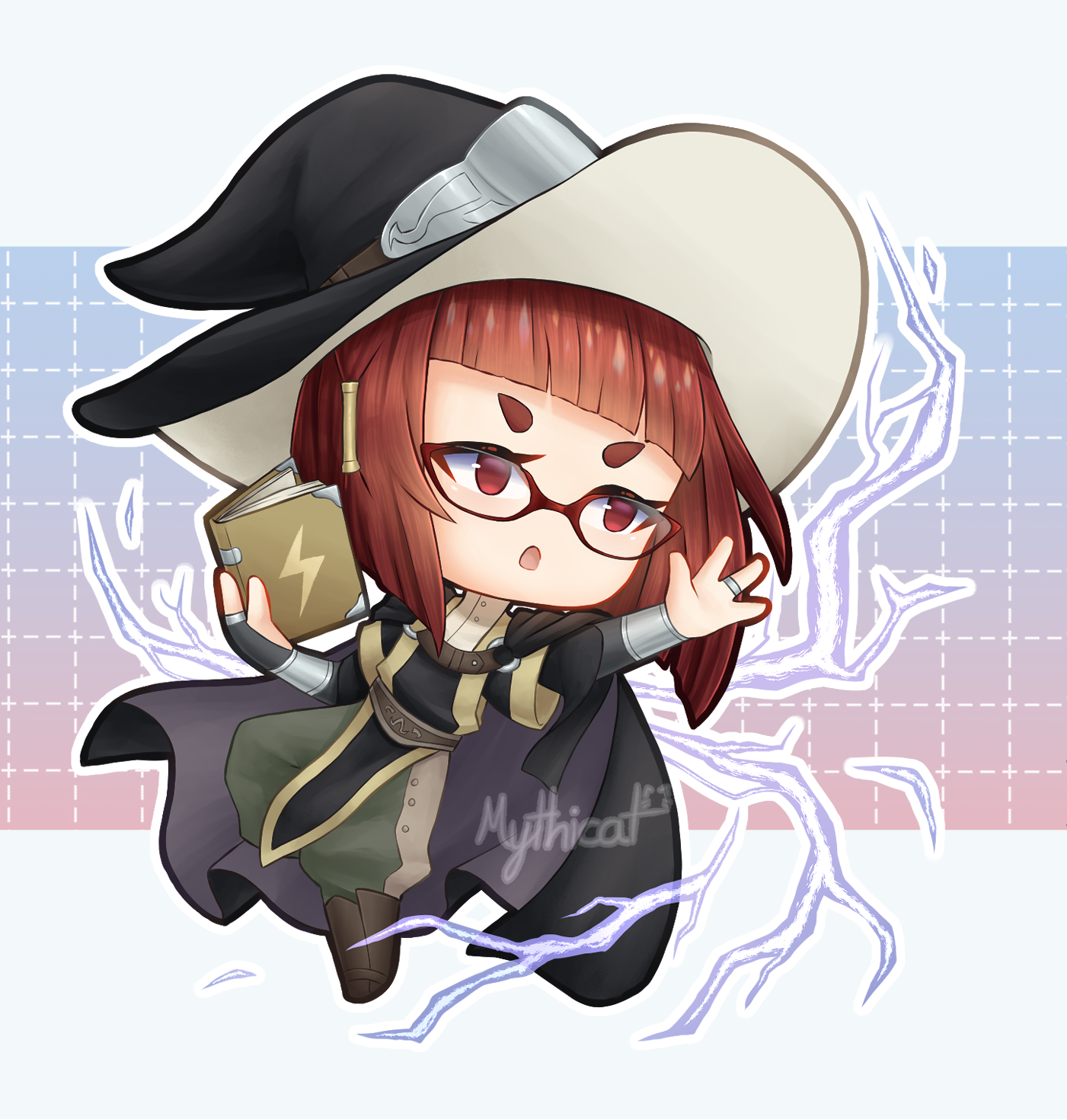 1girl black_bridal_gauntlets book bridal_gauntlets chibi diagonal_bangs fire_emblem fire_emblem_awakening glasses hair_tubes hat highres holding holding_book lightning miriel_(fire_emblem) mythicat nintendo o-ring pants pants_tucked_in red-framed_eyewear red_hair solo turtleneck witch_hat wrist_guards