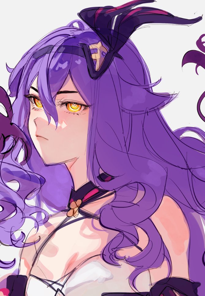 1girl arbk_r bare_shoulders bright_pupils closed_mouth commentary detached_sleeves dress english_commentary frown hair_between_eyes hair_ornament halter_dress halterneck honkai_(series) honkai_impact_3rd portrait purple_hair purple_sleeves simple_background sirin solo symbol-shaped_pupils white_background white_dress white_pupils x-shaped_pupils yellow_eyes