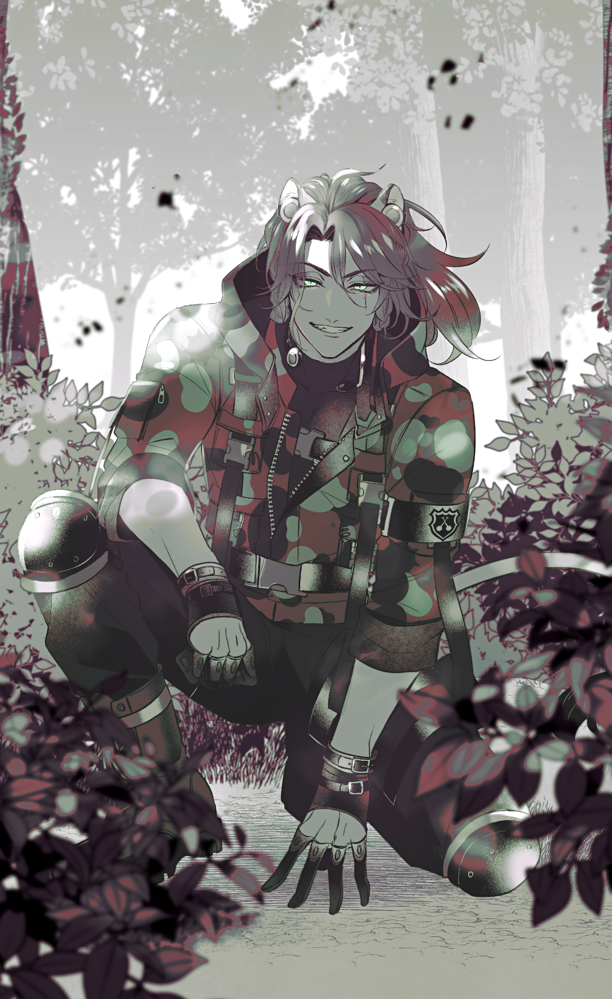 1boy animal_ears beanfest_(twisted_wonderland) commentary_request forest full_body gloves green_eyes half_gloves highres jacket leona_kingscholar lion_boy lion_ears lion_tail long_hair looking_at_viewer male_focus nature on_one_knee outdoors redrabbit44 slit_pupils solo tail twisted_wonderland