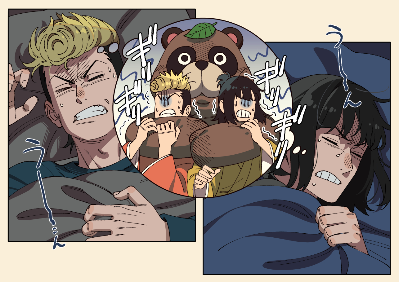 2boys akakokko_(niro_azarashi) akane-banashi asagao_konjakutei black_hair blonde_hair dreaming japanese_clothes kimono multicolored_hair multiple_boys nerimaya_karashi on_bed pompadour shared_thought_bubble sleeping speech_bubble sweat tanuki thought_bubble two-tone_hair under_covers