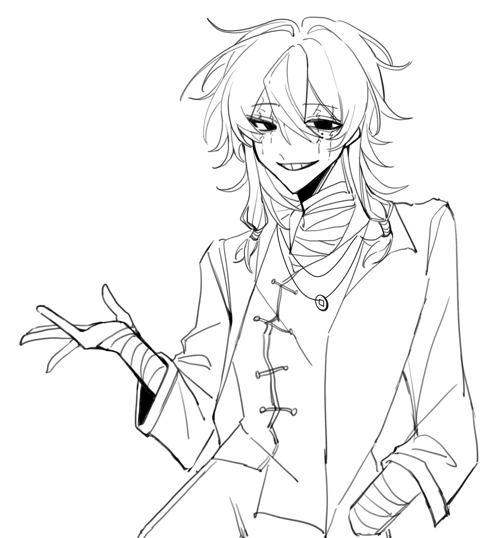 1boy bandaged_arm bandaged_neck bandages chinese_commentary coin coin_on_string commentary_request cowboy_shot greyscale grin hair_between_eyes hand_in_pocket hand_up highres holed_coin jacket jewelry long_hair long_sleeves male_focus mole mole_under_eye monochrome necklace open_clothes open_jacket rollzhumo shirt simple_background smile solo touqi_guaitan white_background ziche_fuzhao