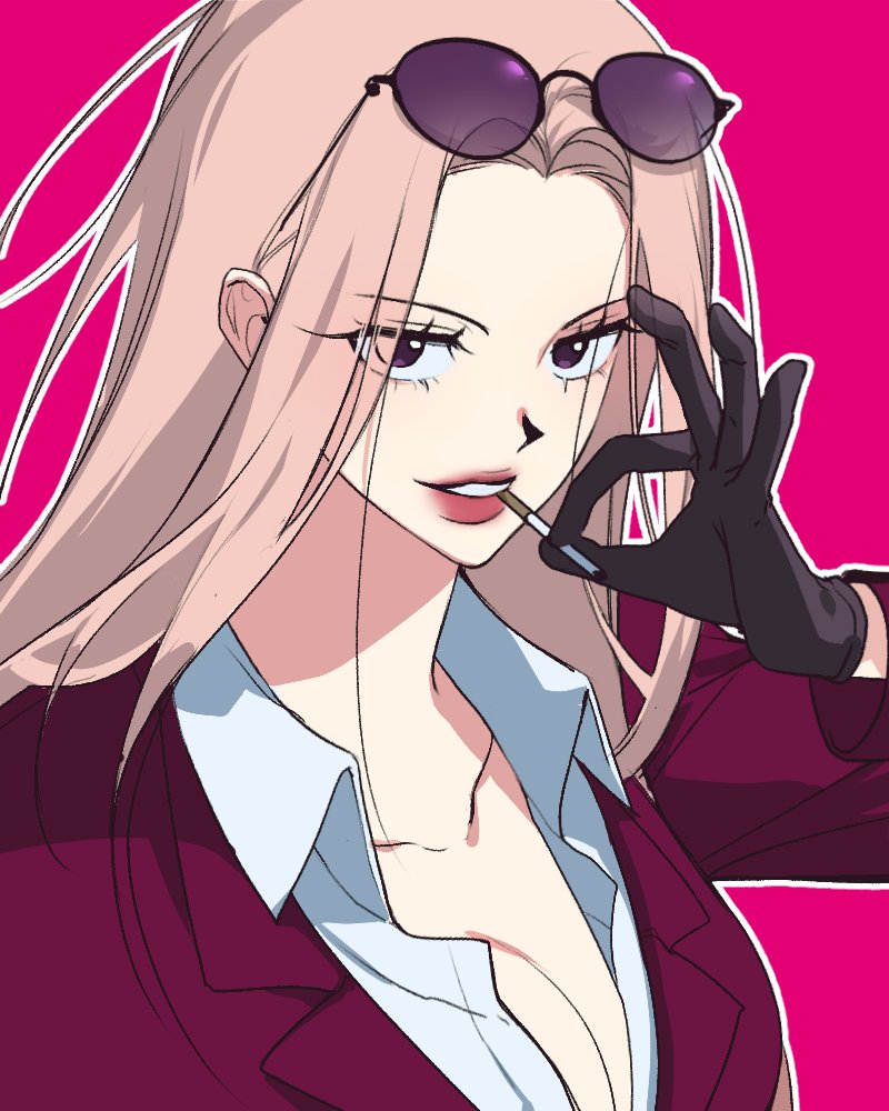 1girl black_gloves cigarette collared_shirt eyelashes eyewear_on_head formal_clothes gloves hina_(one_piece) holding holding_cigarette jacket long_hair looking_at_viewer one_piece pink_background pink_hair ppyobong11 purple_jacket shirt simple_background smile solo suit white_shirt