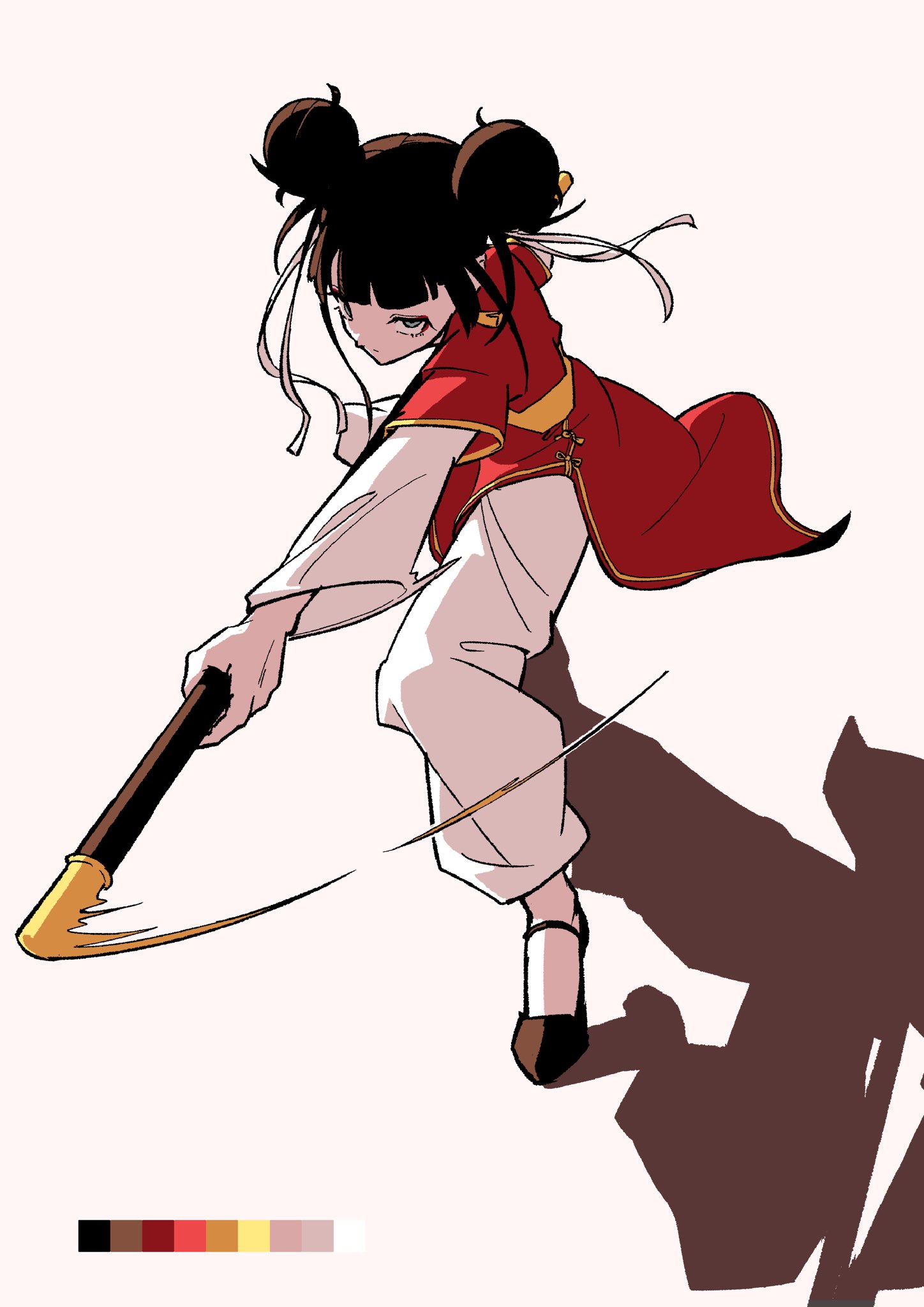 1girl black_hair blunt_bangs bo_staff china_dress chinese_clothes color_guide cosplay double_bun dress fighting_stance full_body gaako_illust hair_bun hair_ribbon highres holding holding_staff journey_to_the_west layered_sleeves long_sleeves looking_at_viewer original outstretched_arm pants ribbon ruyi_jingu_bang shadow short_over_long_sleeves short_sleeves sidelocks simple_background smear_frame solo staff sun_wukong sun_wukong_(cosplay) white_background white_pants white_ribbon