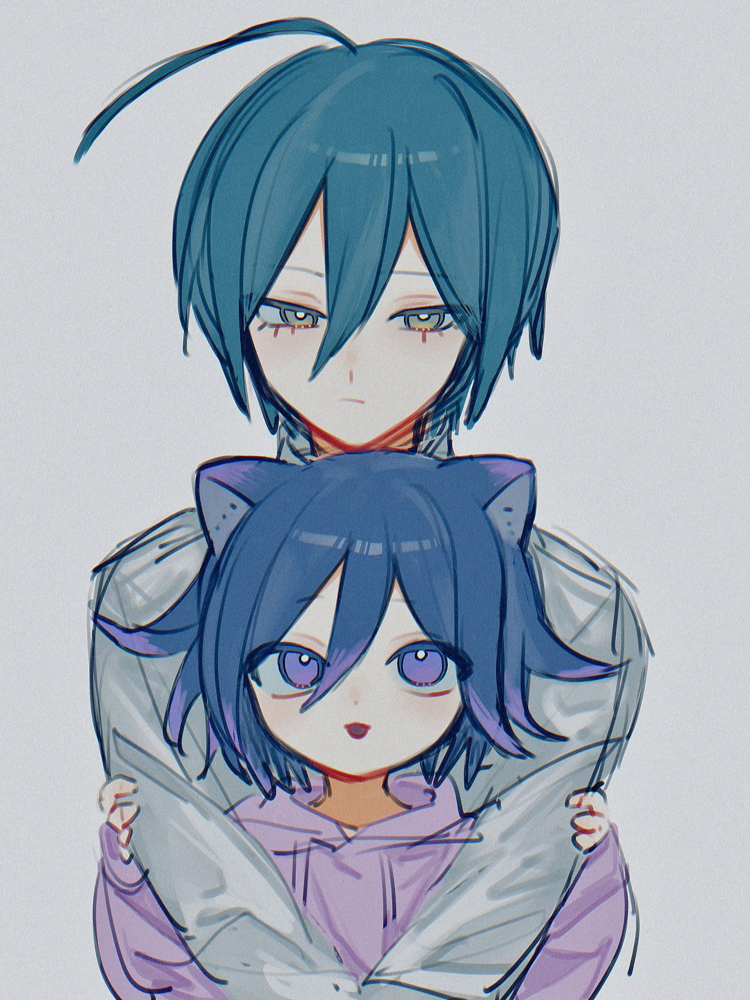 2boys age_difference aged_down ahoge animal_ears black_hair blue_hair cat_boy cat_ears child closed_mouth commentary_request danganronpa_(series) danganronpa_v3:_killing_harmony eyelashes flipped_hair grey_background grey_hoodie hair_between_eyes height_difference highres hood hoodie hug hug_from_behind long_sleeves looking_at_viewer looking_up male_focus multiple_boys narrowed_eyes oma_kokichi open_mouth pink_hoodie purple_eyes purple_hair saihara_shuichi short_hair simple_background sketch smile upper_body yellow_eyes ze_ro_saiji