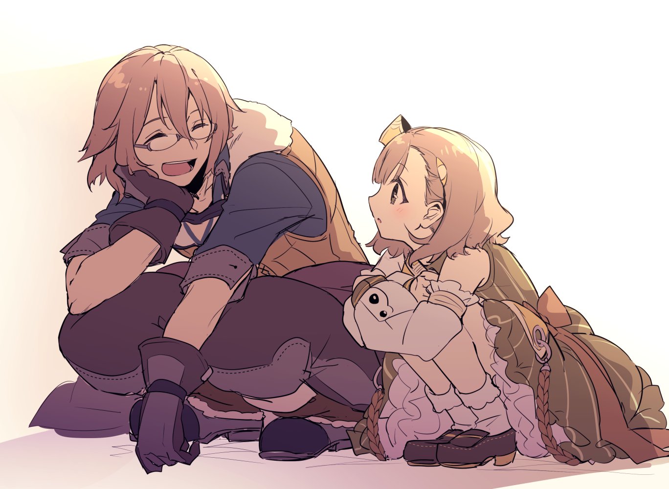 1boy 1girl :d atelier_(series) atelier_escha_&_logy awin_sidelet blue_shirt brown_eyes brown_footwear brown_gloves brown_hair brown_pants brown_vest closed_eyes commentary_request crossed_arms detached_sleeves dress frilled_socks frills full_body glasses gloves green_dress hair_between_eyes hand_on_own_cheek hand_on_own_face hand_up hat karasumi_(aiseec) long_sleeves looking_at_another lucille_ernella open_mouth pants rimless_eyewear shirt shoes short_hair simple_background smile socks squatting vest white_background white_socks