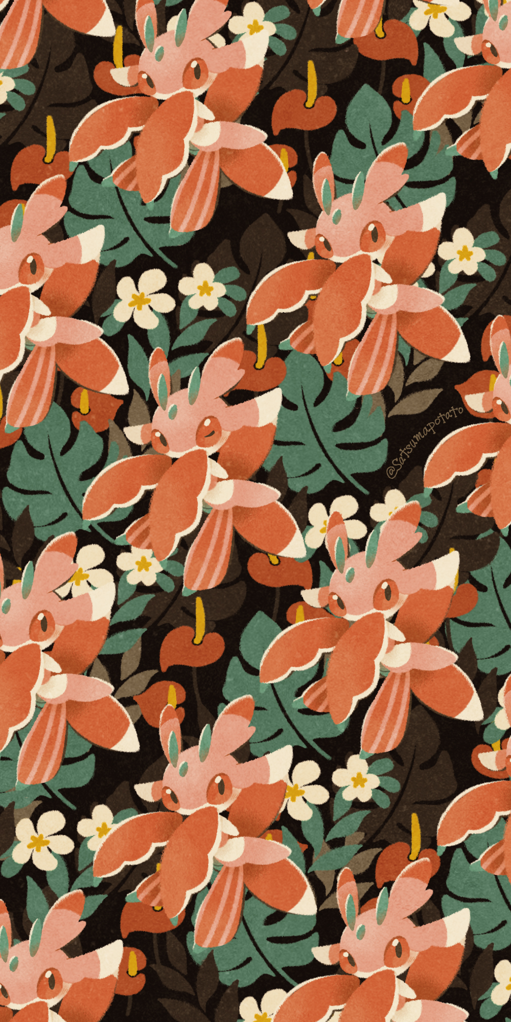 blush covering_own_mouth flower flower_request full_body gen_7_pokemon highres leaf looking_at_viewer lurantis nintendo no_humans one_eye_closed pinstripe_pattern pokemon pokemon_(creature) red_eyes red_flower satsumapotato twitter_username white_flower