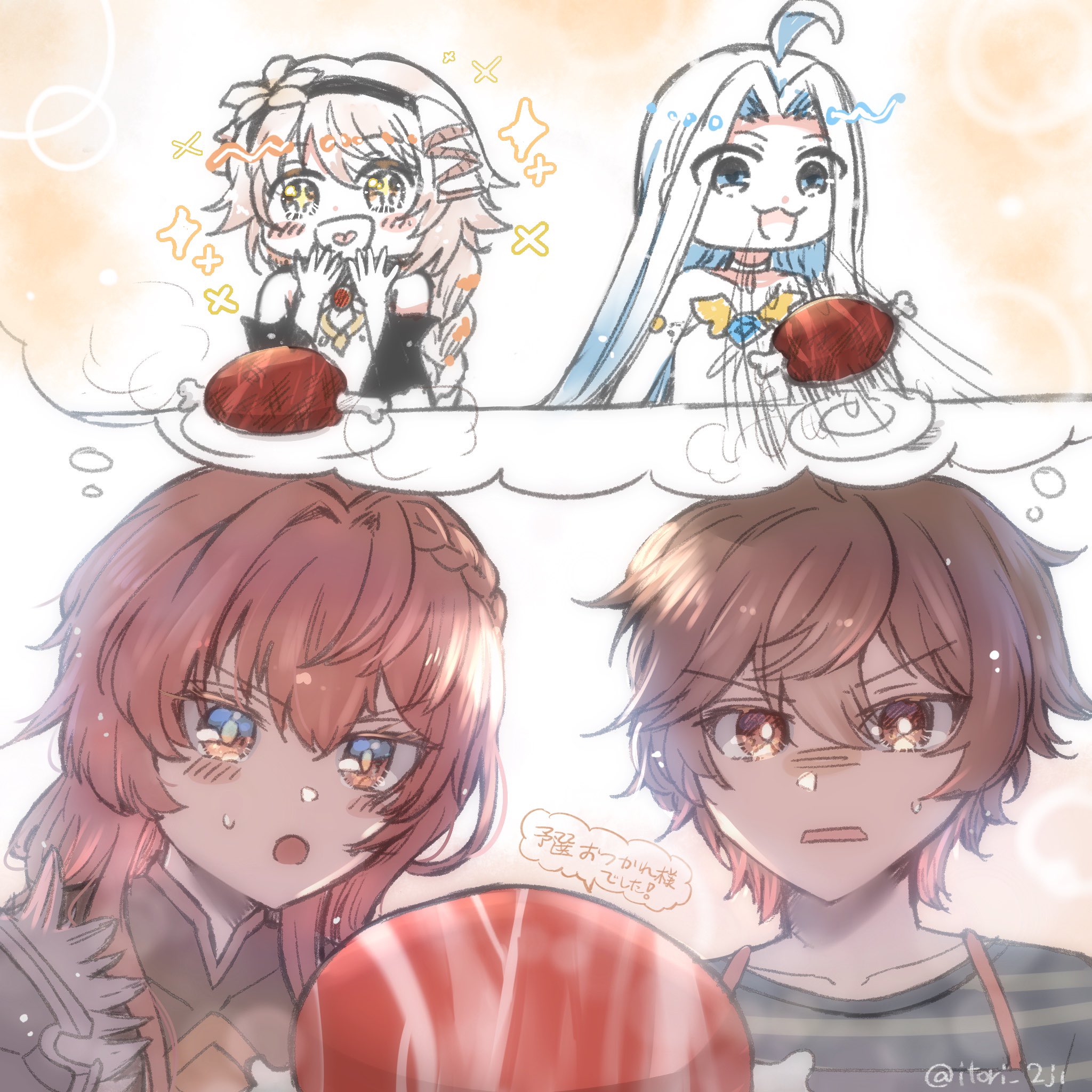 1boy 3girls ahoge blue_eyes blue_hair braid braided_ponytail choker detached_sleeves dress fenie_(granblue_fantasy) flower flower_hairband flower_ornament food granblue_fantasy highres horizontal-striped_clothes imagining itori_(itori_2ji) long_braid long_hair lyria_(granblue_fantasy) meat messy_hair mother_and_child mother_and_daughter multiple_girls orange_hair parent_and_child red_hair sabrina_(granblue_fantasy) sandalphon_(granblue_fantasy) single_shoulder_pad sparkling_eyes speech_bubble thought_bubble very_long_hair white_choker white_dress yellow_flower