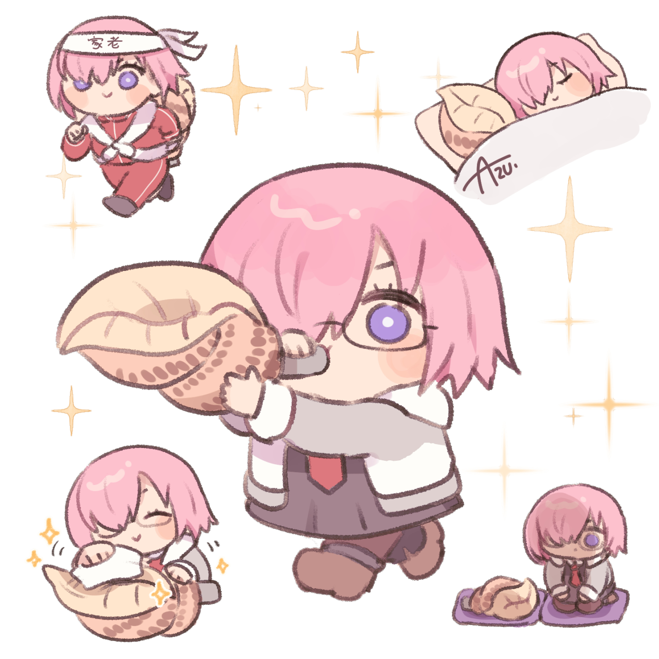 1girl alternate_costume azu_(kirara310) black_dress blowing blush_stickers boots brown_footwear brown_pantyhose chibi chibi_only cleaning cleaning_rag closed_mouth commentary conch dress fate/grand_order fate_(series) glasses grey_jacket hachimaki hair_over_one_eye headband highres holding holding_shell jacket mash_kyrielight multiple_views necktie pantyhose pillow pink_hair purple_eyes red_necktie red_track_suit running seiza shell short_hair signature simple_background sitting sleeping smile sparkle track_suit translated under_covers white_background white_headband