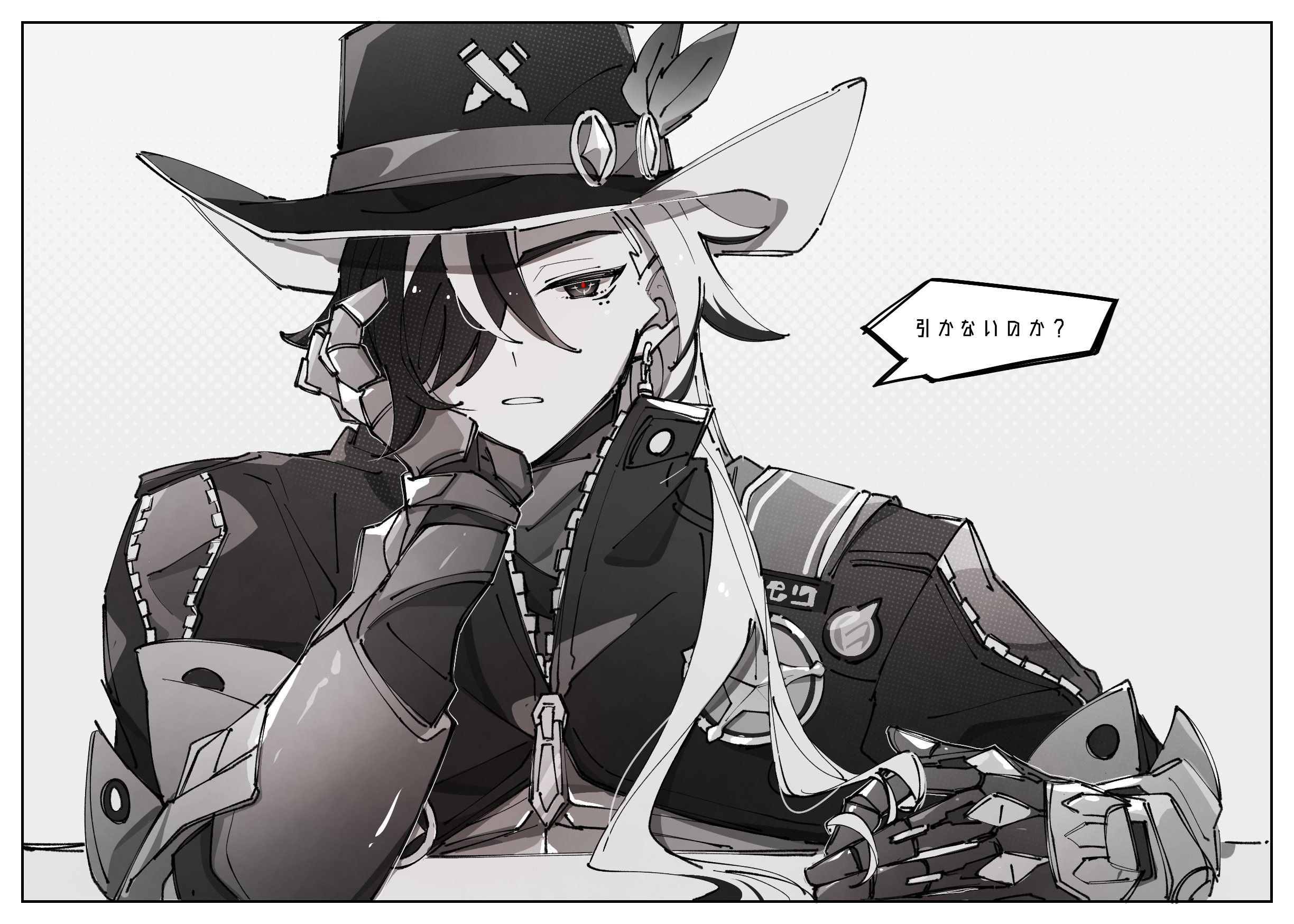 1boy boothill_(honkai:_star_rail) border commentary_request cowboy_hat crossed_bangs crosshair_pupils cyborg earrings elbow_rest expressionless grey_background greyscale hair_over_one_eye halftone halftone_background hand_up hat hat_feather head_rest highres honkai:_star_rail honkai_(series) jacket jewelry jifu_(gifu_7) long_hair looking_at_viewer male_focus mole mole_under_eye monochrome multicolored_hair one_eye_covered parted_bangs parted_lips red_pupils sheriff_badge short_sleeves simple_background solo speech_bubble spot_color streaked_hair translation_request upper_body white_background white_border zipper zipper_pull_tab