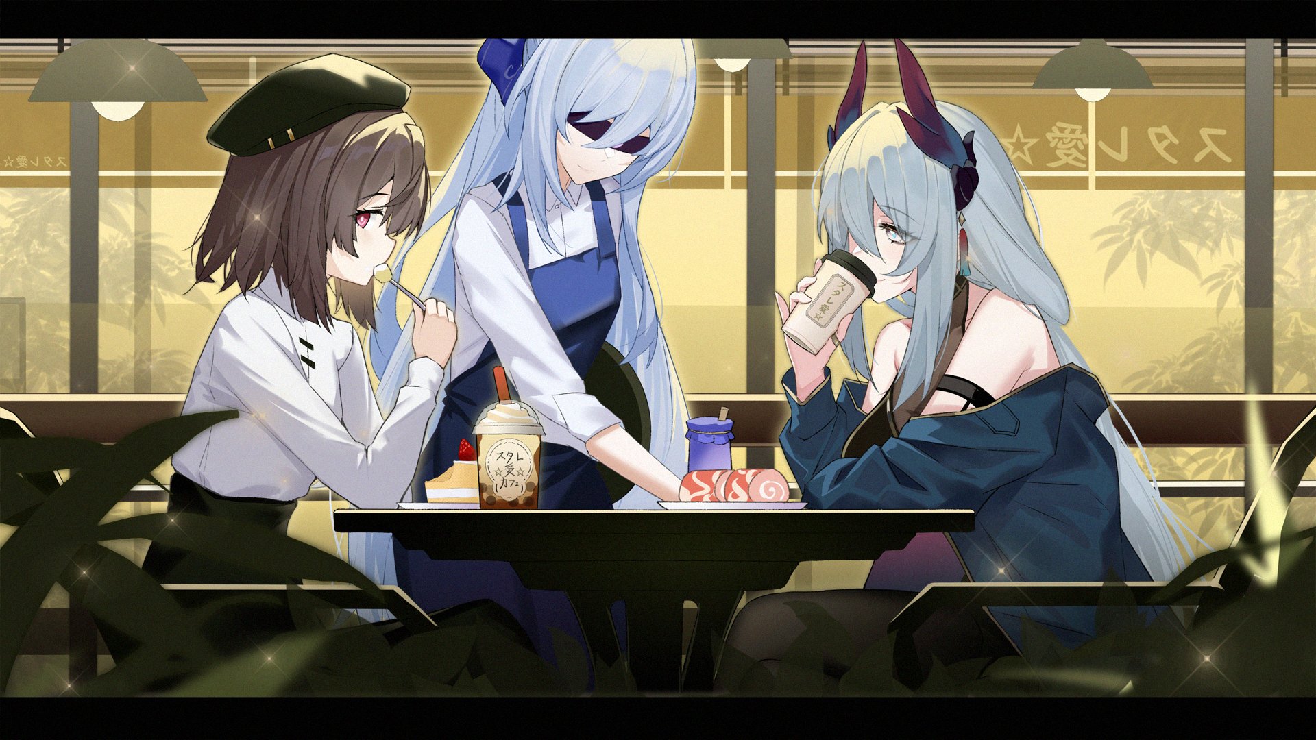 3girls apron bare_shoulders beret black_hat blindfold blue_eyes blue_hair brown_hair cafe ceiling_light cup disposable_coffee_cup disposable_cup feather_hair_ornament feathers fork grey_hair hair_ornament half_updo hanya_(honkai:_star_rail) hat highres holding holding_fork honkai:_star_rail honkai_(series) indoors jacket jingliu_(honkai:_star_rail) long_hair multiple_girls red_eyes sidelocks sitting skirt smile srpzk waitress xueyi_(honkai:_star_rail)
