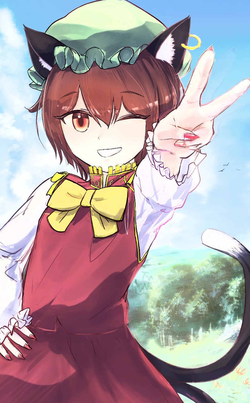 1girl ;d animal_ear_fluff animal_ear_piercing animal_ears arm_up bird bow bowtie brown_eyes brown_hair cat_ears cat_tail chen cloud commentary_request day earrings fingernails flat_chest foreshortening frills green_hat grin hair_between_eyes hand_on_own_hip hat highres jewelry light_blush long_sleeves looking_at_viewer mob_cap multiple_tails nail_polish nekomata one_eye_closed open_mouth outdoors outstretched_arm perspective red_nails red_skirt red_vest sharp_fingernails short_hair single_earring skirt skirt_set sky smile solo tail touhou tree two_tails v vest yellow_bow yellow_bowtie yonkome24