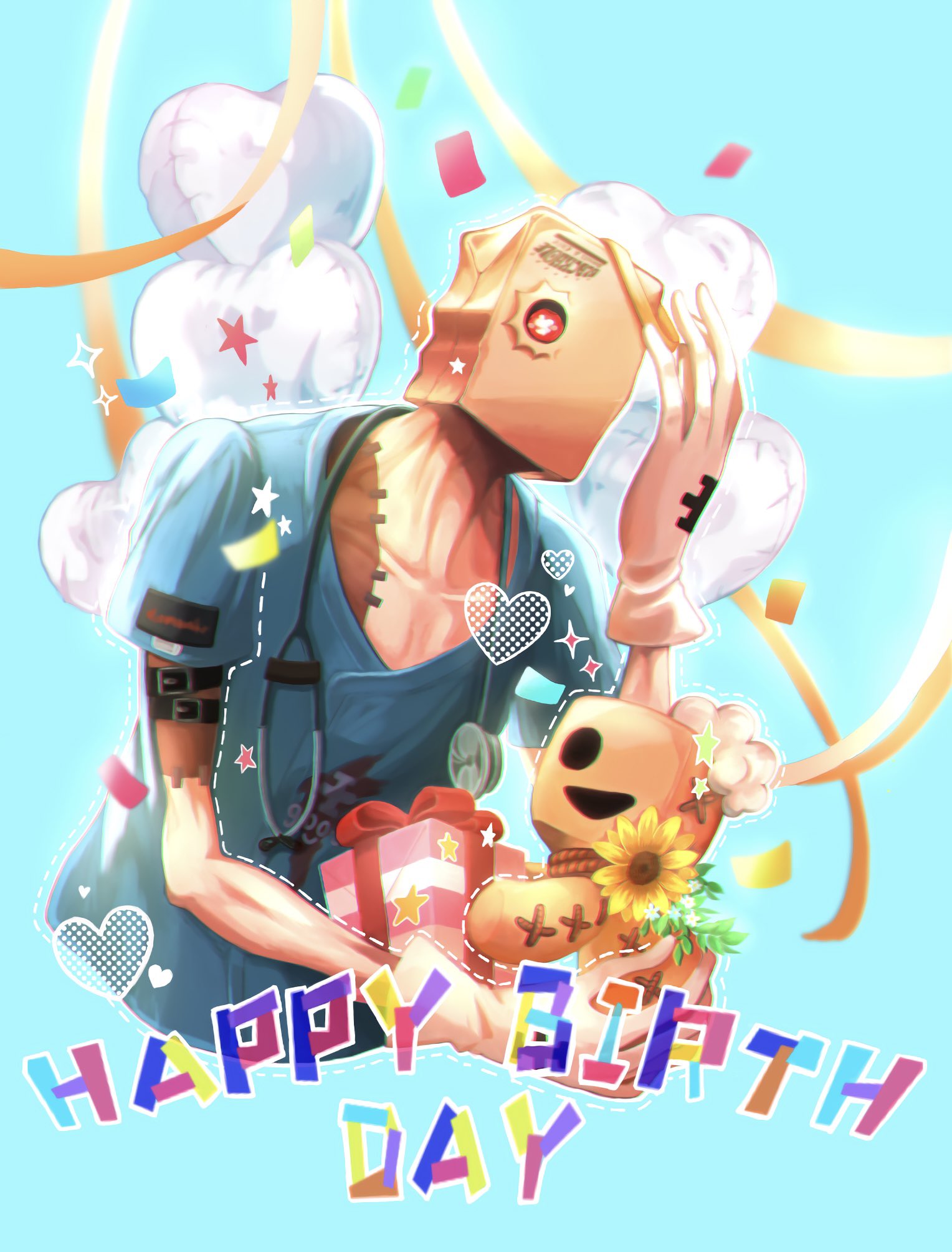 1boy arm_belt arm_up bag bag_over_head balloon belt black_belt blue_background blue_shirt chimi_3ame0809 collarbone commentary confetti cropped_torso english_text faust_(guilty_gear) flower gift gloves guilty_gear guilty_gear_strive happy_birthday heart heart_balloon highres holding male_focus multiple_belts one_eye_covered paper_bag red_eyes red_ribbon ribbon shirt short_sleeves solo sparkle stethoscope stitched_torso stitches sunflower upper_body white_gloves yellow_flower
