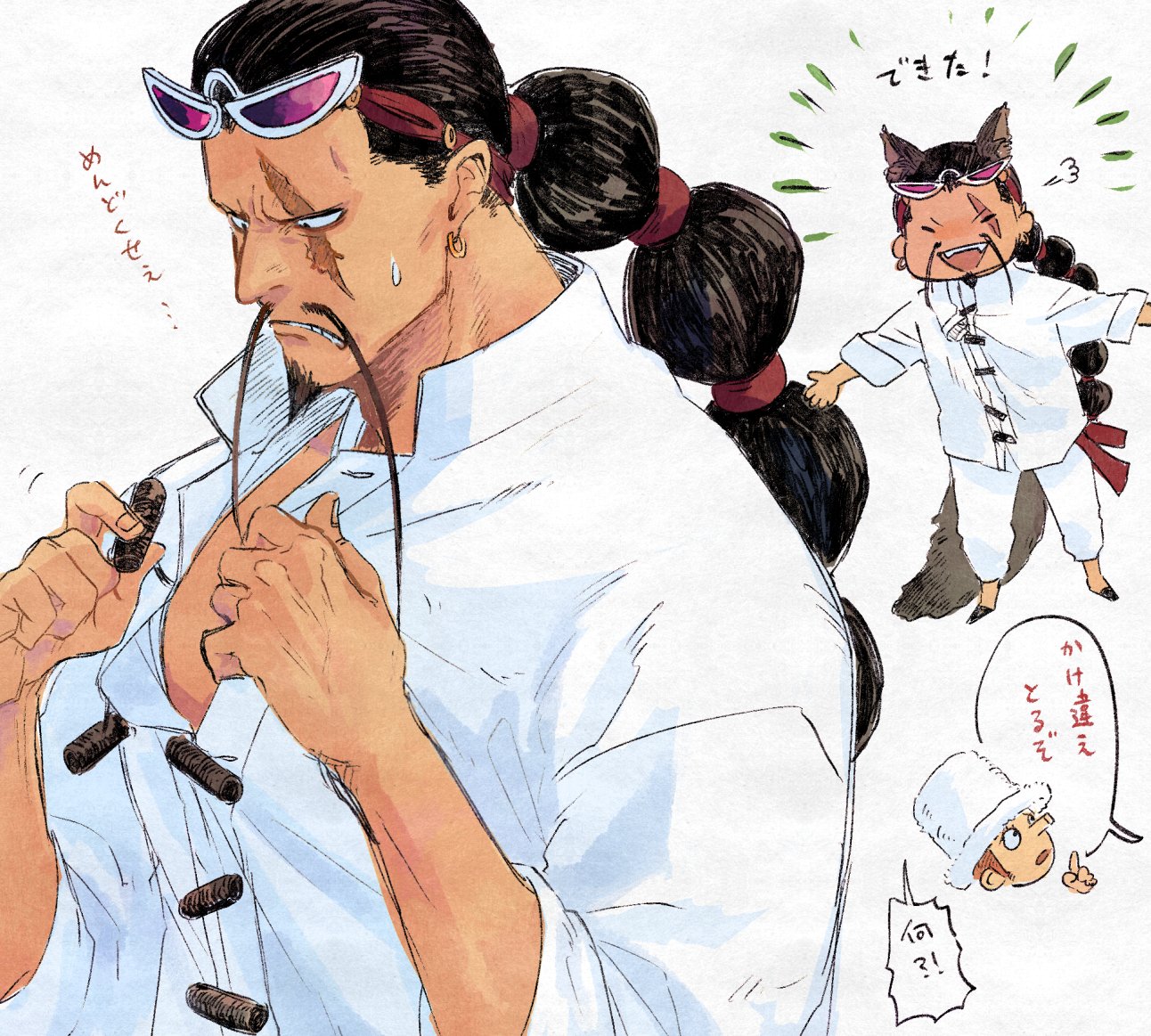 2boys animal_ear_fluff animal_ears arms_up black_footwear chinese_clothes closed_eyes clothes_grab collared_shirt commentary ear_piercing earrings eyewear_on_head facial_hair fangs fu_manchu_(mustache) goatee hair_ribbon hair_tie hat jabra_(one_piece) jewelry kaku_(one_piece) long_mustache long_nose looking_at_hands male_focus mature_male multiple_boys multiple_views mustache musubi_rolling notice_lines one_piece open_clothes open_mouth open_shirt outstretched_arm pants piercing pink-tinted_eyewear puff_of_air red_ribbon ribbon scar scar_across_eye scar_on_face shirt shoes simple_background single_earring sleeve_cuffs solo_focus speech_bubble tail teeth tinted_eyewear tongue top_hat white-framed_eyewear white_background white_hat white_pants white_shirt wolf_ears wolf_tail
