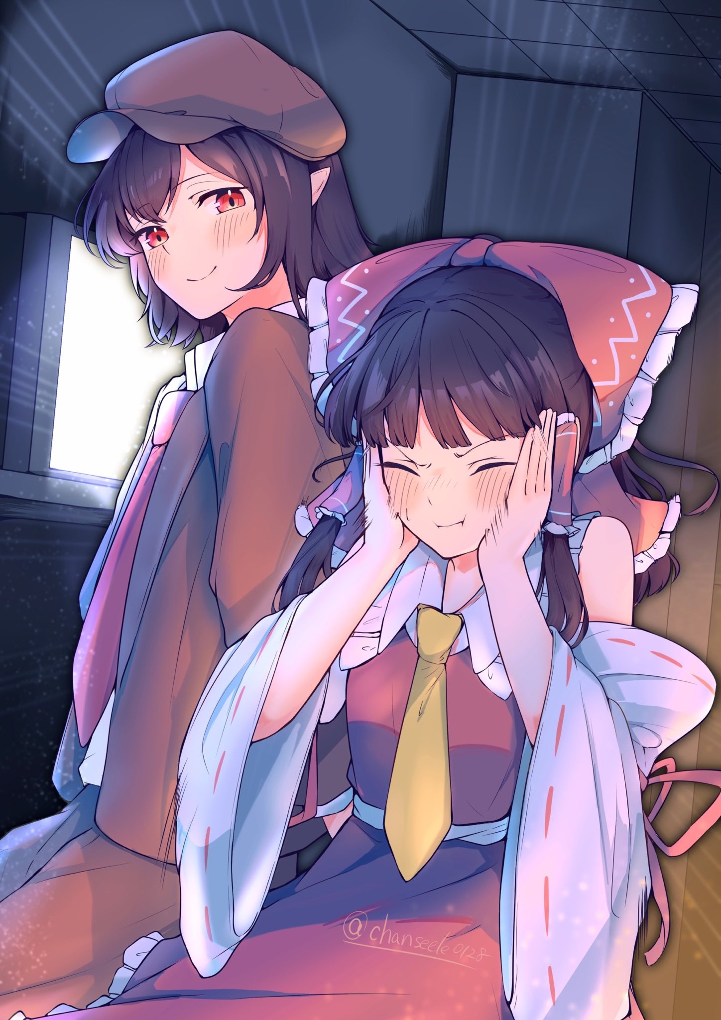 2girls ascot black_hair blush bow brown_hat brown_jacket newsboy_cap closed_mouth collared_shirt commentary_request detached_sleeves flat_cap frilled_bow frilled_hair_tubes frills hair_bow hair_tubes hakurei_reimu hat highres jacket long_hair long_sleeves multiple_girls necktie official_alternate_costume pointy_ears red_bow red_eyes red_necktie red_skirt ribbon-trimmed_sleeves ribbon_trim seele_(chanseele0128) shameimaru_aya shameimaru_aya_(newsboy) shirt skirt skirt_set slapping smile suit_jacket touhou twitter_username white_shirt yellow_ascot