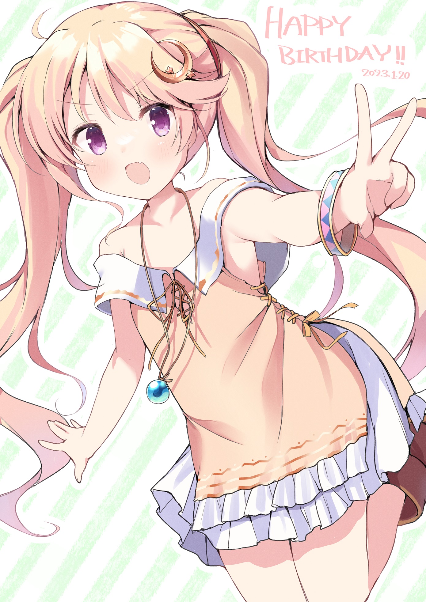 1girl 2023 :d \||/ bare_shoulders blonde_hair blush bracelet brown_footwear brown_shirt collarbone commentary_request crescent crescent_hair_ornament dated dutch_angle fang feet_up flat_chest floating_hair frilled_skirt frills hair_between_eyes hair_ornament happy happy_birthday highres iris_mysteria! jewelry jumping ladis_(iris_mysteria!) long_hair looking_at_viewer miniskirt necklace off-shoulder_shirt off_shoulder open_mouth outstretched_arm purple_eyes shirt sidelocks simple_background skin_fang skirt sleeveless sleeveless_shirt smile solo star_(symbol) star_hair_ornament striped_background takepoison twintails v very_long_hair white_skirt