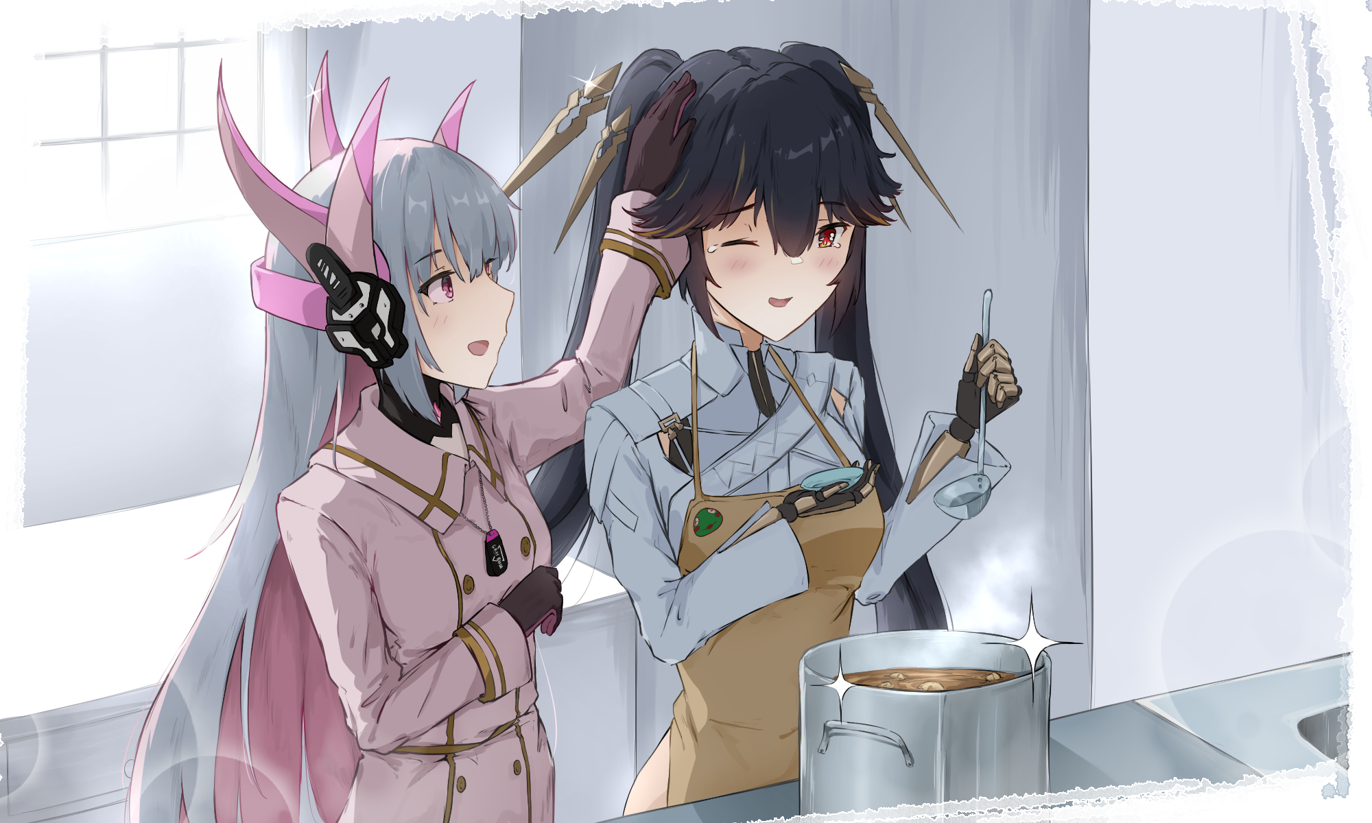 2girls aikawa_yumi apron black_gloves black_hair brown_apron colored_inner_hair cooking dog_tags floating_headgear frog gloves grey_hair hair_ornament headgear headpat highres jacket ladle liv:_eclipse_(pgr) liv_(pgr) long_hair lucia:_pyroath_(pgr) mechabare mechanical_arms mechanical_hands multicolored_hair multiple_girls one_eye_closed open_mouth pink_eyes pink_hair pink_jacket punishing:_gray_raven red_eyes sidelocks twintails very_long_hair white_jacket