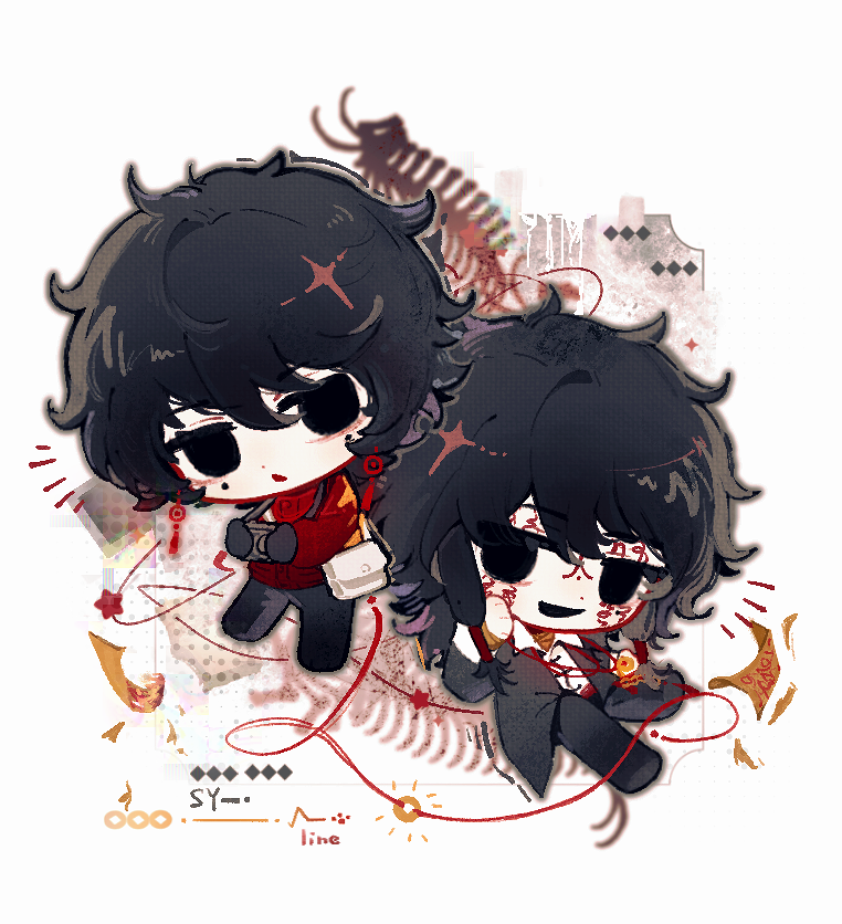 2boys bag black_eyes black_gloves black_hair black_jacket black_pants camera camera_around_neck chibi chibi_only chinese_commentary collared_shirt commentary_request facial_tattoo gloves hand_on_own_cheek hand_on_own_face holding holding_camera jacket li_yuting_(male) long_sleeves male_focus medium_hair messenger_bag mole mole_under_each_eye mole_under_eye multiple_boys multiple_moles open_clothes open_jacket open_mouth pants red_jacket shirt short_hair shoulder_bag smile soyuii tattoo touqi_guaitan triangle_mouth white_bag white_shirt ziche_fuzhao