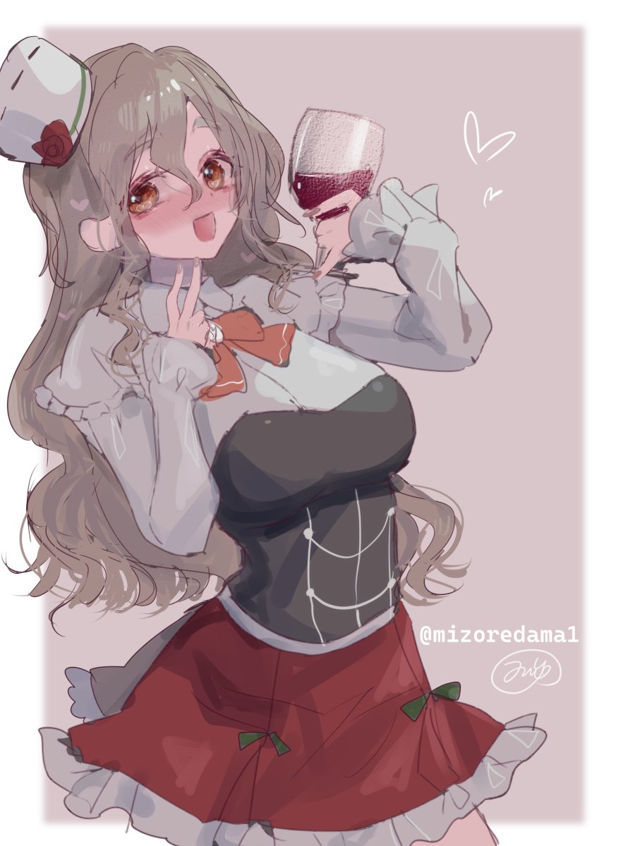 1girl alcohol blush bodice bow bowtie breasts brown_eyes collared_shirt commentary_request cup dress_shirt drinking_glass drunk grey_hair hair_between_eyes hat highres kantai_collection large_breasts long_hair mini_hat mizoredama1 nose_blush one-hour_drawing_challenge open_mouth pola_(kancolle) red_bow red_bowtie red_skirt shirt skirt smile solo thick_eyebrows tilted_headwear wavy_hair white_shirt wine wine_glass