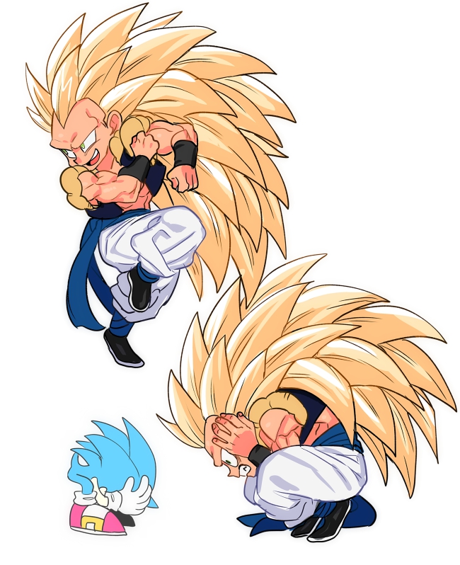 2boys baggy_pants black_footwear blonde_hair blue_eyes blue_sash child cropped_vest dragon_ball gotenks hands_on_own_head legband long_hair metamoran_vest multiple_boys multiple_views muscular muscular_male nanika_(nnkgh) no_eyebrows open_mouth pants saiyan sash sonic_(series) sonic_the_hedgehog sonic_the_hedgehog_(classic) spiked_hair squatting super_saiyan super_saiyan_3 very_long_hair vest white_background white_pants wristband