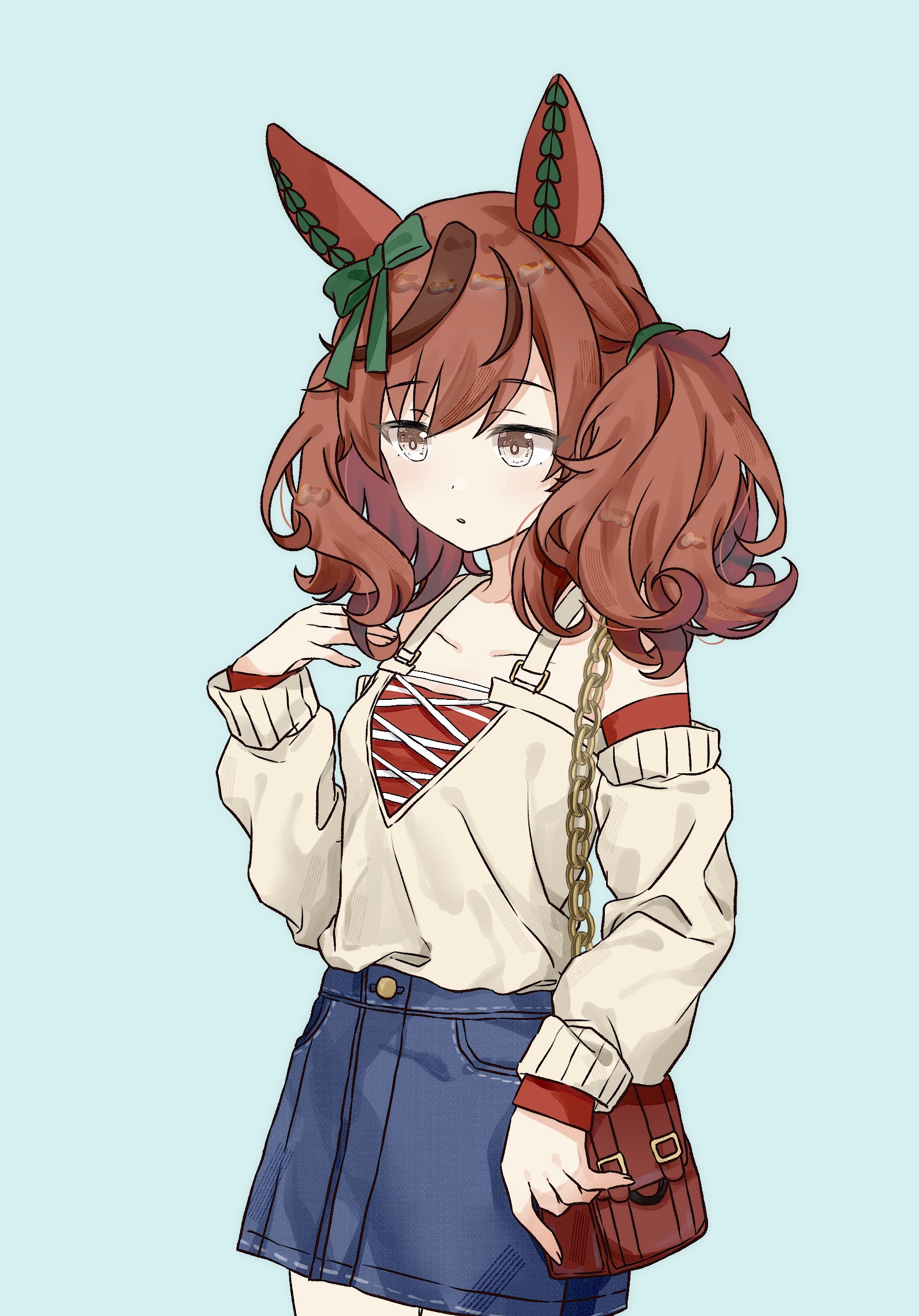 1girl animal_ears bag bare_shoulders blue_background brown_eyes brown_hair ear_covers handbag highres horse_ears nice_nature_(umamusume) off_shoulder simple_background skirt solo umamusume zeniaguan