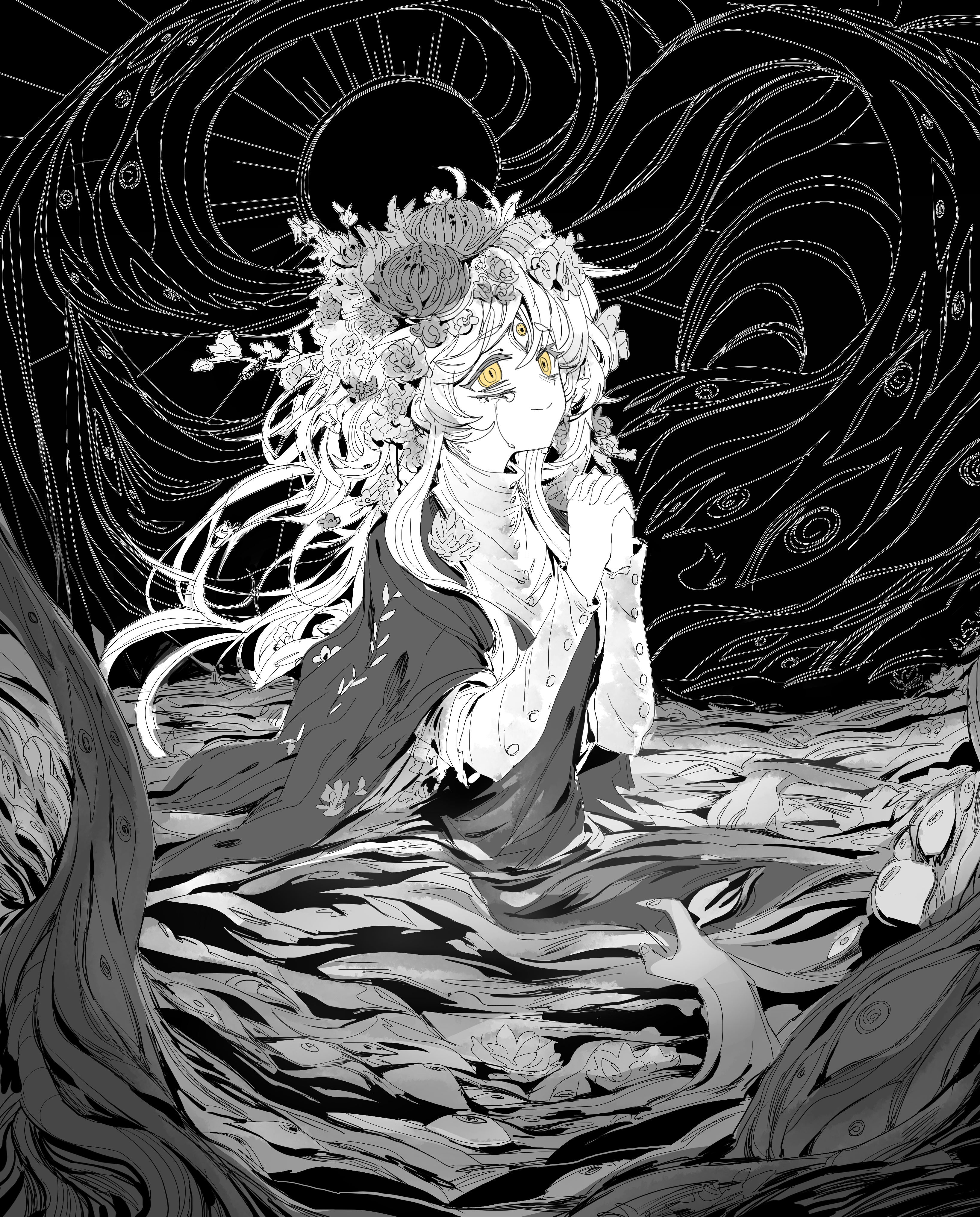 1girl absurdres black_dress charlotte_wiltshire charlotte_wiltshire_(oracle) crying dated_commentary dress eldritch_abomination extra_eyes flower greyscale hair_flower hair_ornament halo happy_tears hello_charlotte highres long_hair long_sleeves mia_(39565899) monochrome own_hands_clasped own_hands_together praying ringed_eyes shirt smile solo spot_color tears third_eye upper_body yellow_eyes