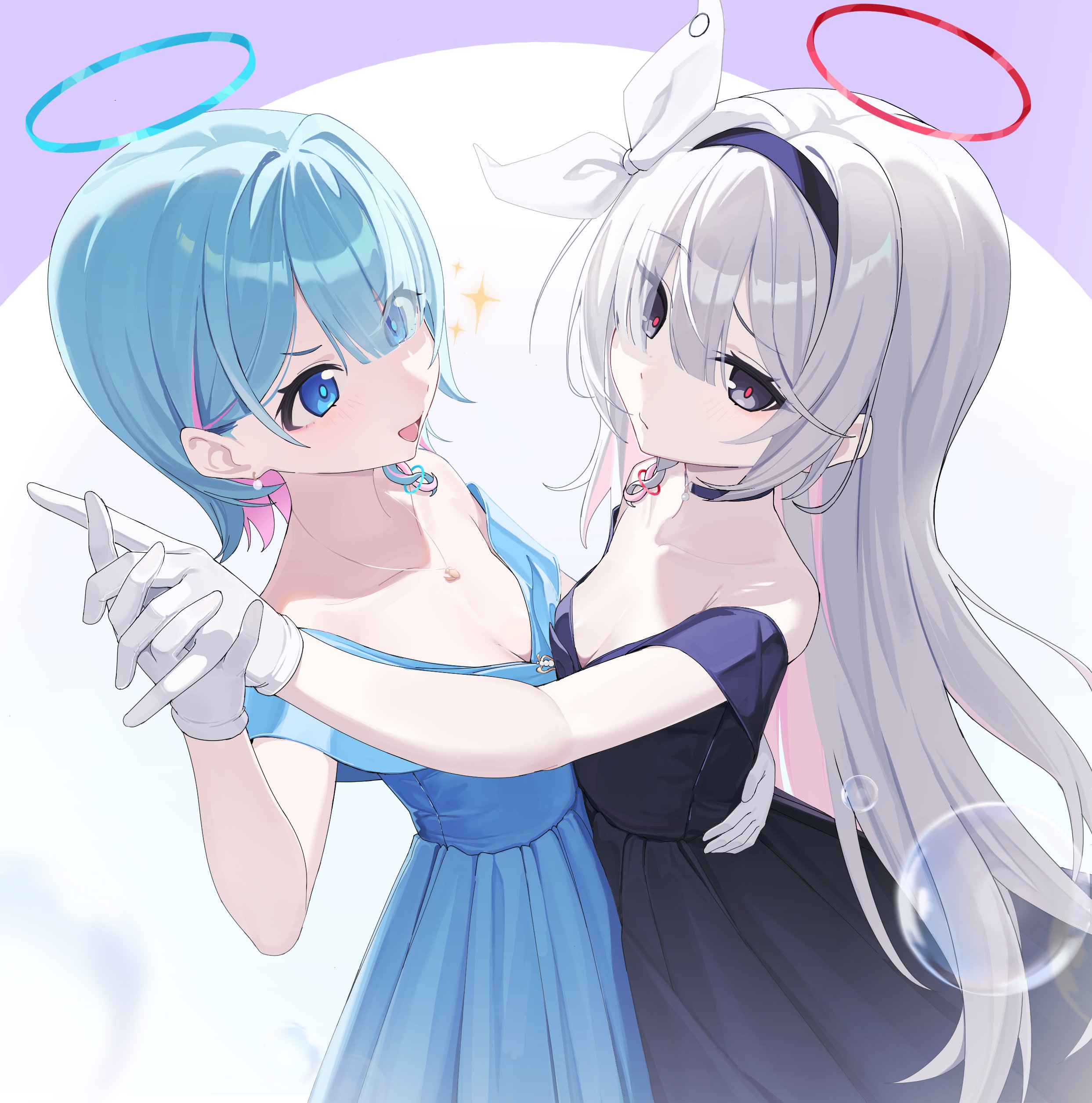2girls absurdres alternate_hairstyle arona_(blue_archive) black_dress black_eyes black_hairband blue_archive blue_dress blue_eyes blue_hair blush braid breast_press breasts choker cleavage colored_inner_hair dancing dress gloves hair_over_one_eye hairband halo hashtag-only_commentary highres holding_hands long_hair looking_at_viewer multicolored_hair multiple_girls official_alternate_costume open_mouth pink_hair plana_(blue_archive) plana_(dress)_(blue_archive) red_halo red_pupils short_hair single_braid small_breasts symmetrical_docking white_gloves white_hair xubai yuri