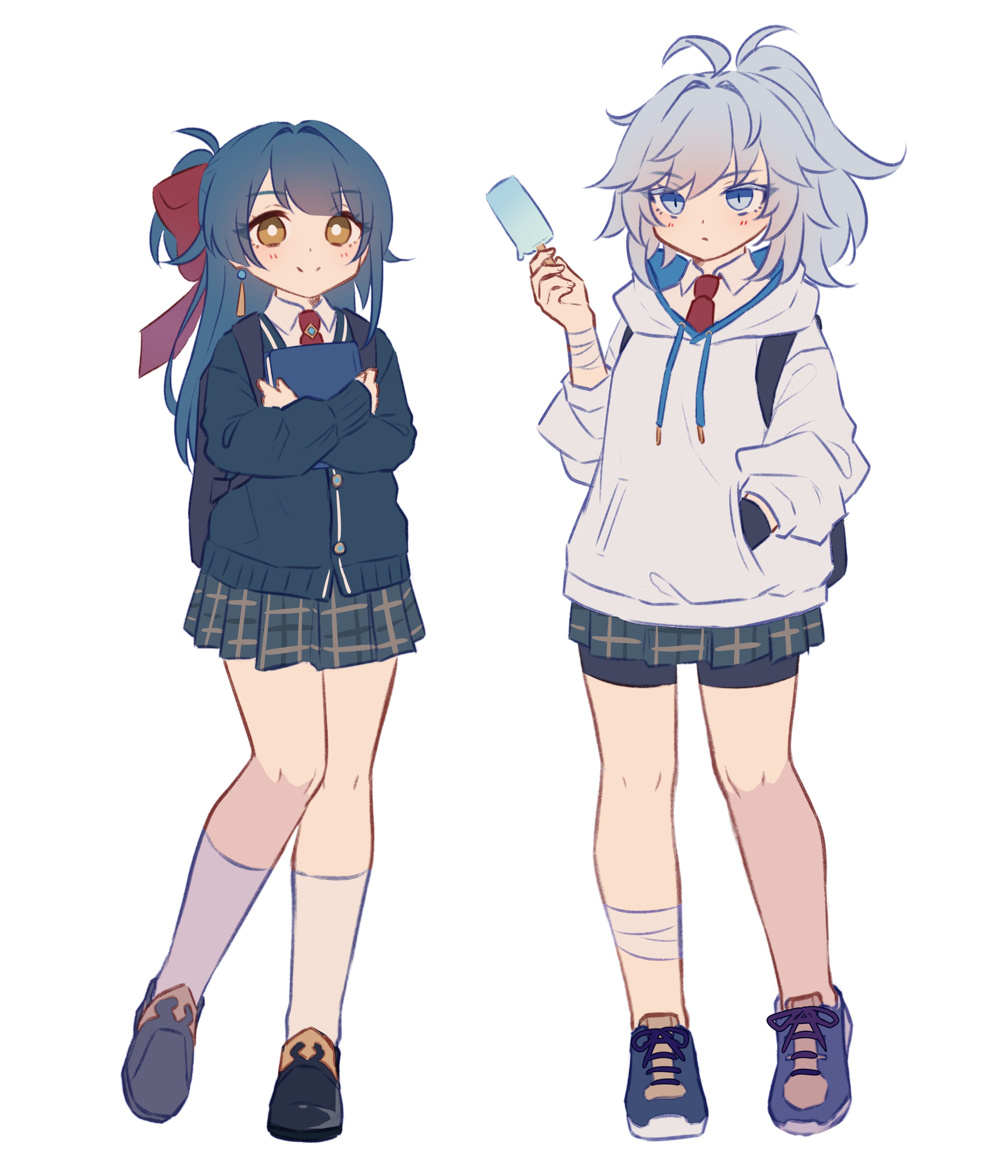 2girls absurdres backpack bag black_footwear black_jacket black_shorts blue_eyes blue_hair chongyun_(genshin_impact) chongyun_(gigo)_(genshin_impact) closed_mouth food genderswap genderswap_(mtf) genshin_impact green_skirt hair_ornament hair_ribbon highres holding holding_food holding_popsicle hood hoodie jacket long_hair long_sleeves multiple_girls ponytail popsicle red_ribbon ribbon shoes shorts skirt tsukiaki_teriyaki white_background white_hoodie xingqiu_(genshin_impact) xingqiu_(gigo)_(genshin_impact) yellow_eyes