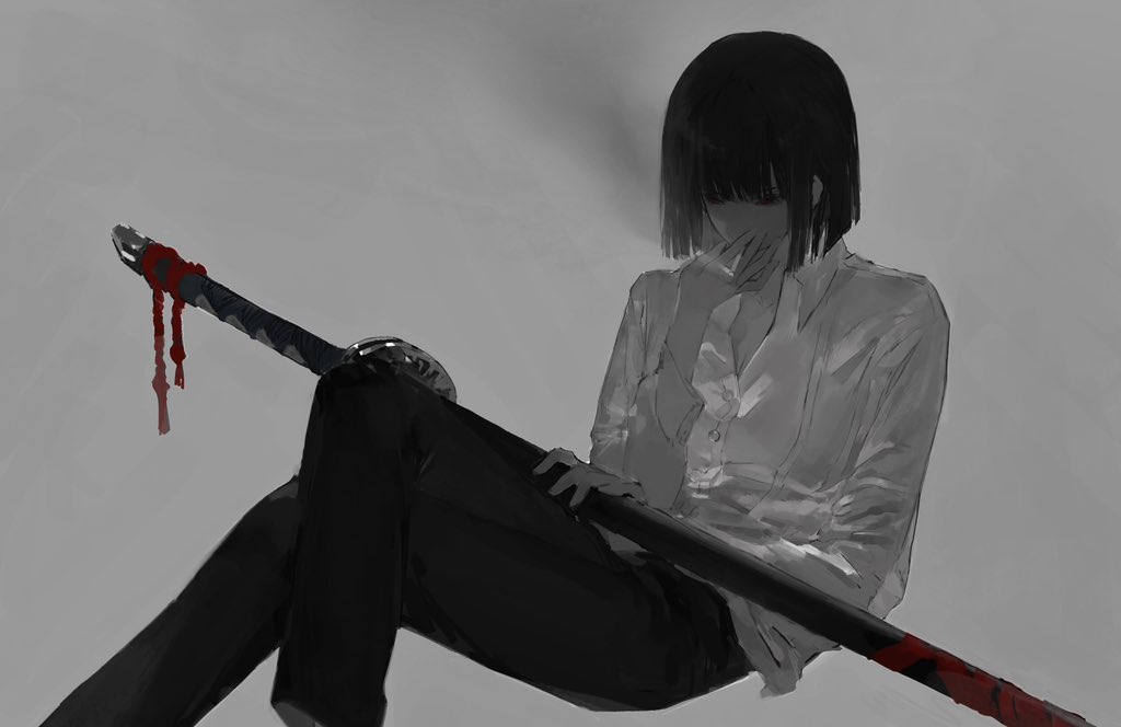 1girl black_hair black_pants bob_cut cigarette collared_shirt holding holding_sword holding_weapon knees_up limbus_company long_sleeves muisumk muted_color ootachi pants project_moon ryoshu_(project_moon) shirt short_hair sitting smoke smoking solo sword weapon white_shirt