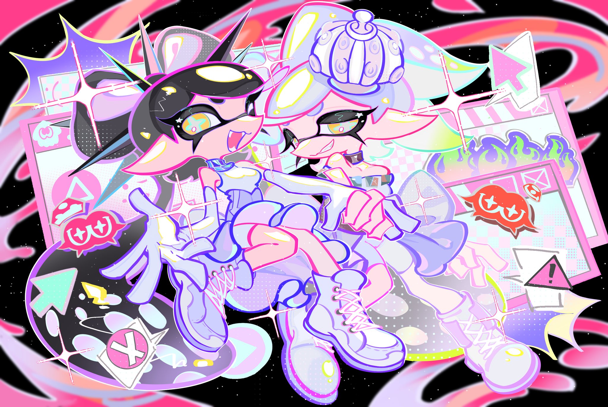 2girls black_background black_hair bow-shaped_hair breasts brown_choker callie_(grand_festival)_(splatoon) callie_(splatoon) chinese_commentary choker commentary_request cross-laced_footwear cross-shaped_pupils cursor elbow_gloves fangs full_body gloves grey_hair grin half-closed_eyes hat highres holding_hands inkling long_hair long_pointy_ears looking_at_viewer marie_(grand_festival)_(splatoon) marie_(splatoon) multiple_girls nintendo off-shoulder_shirt off_shoulder official_alternate_costume one_eye_closed open_mouth orange_eyes pink_pupils pointy_ears shirt short_hair shorts shorts_under_skirt skirt sleeveless sleeveless_shirt smile splatoon_(series) splatoon_3 symbol-shaped_pupils tentacle_hair twintails white_footwear white_gloves white_hat white_shirt white_shorts white_skirt window_(computing) xiaoyunatie