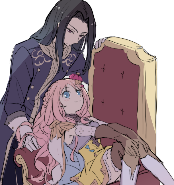 1boy 1girl armor atelier_(series) atelier_lulua black_coat black_hair blue_eyes breastplate brown_gloves cape closed_mouth coat commentary_request crown dress epaulettes gloves hands_on_own_knees karasumi_(aiseec) long_hair long_sleeves looking_at_another looking_down looking_up merurulince_rede_arls pink_hair rufus_falken simple_background sitting on_throne sitting_sideways smile throne white_background white_cape yellow_dress