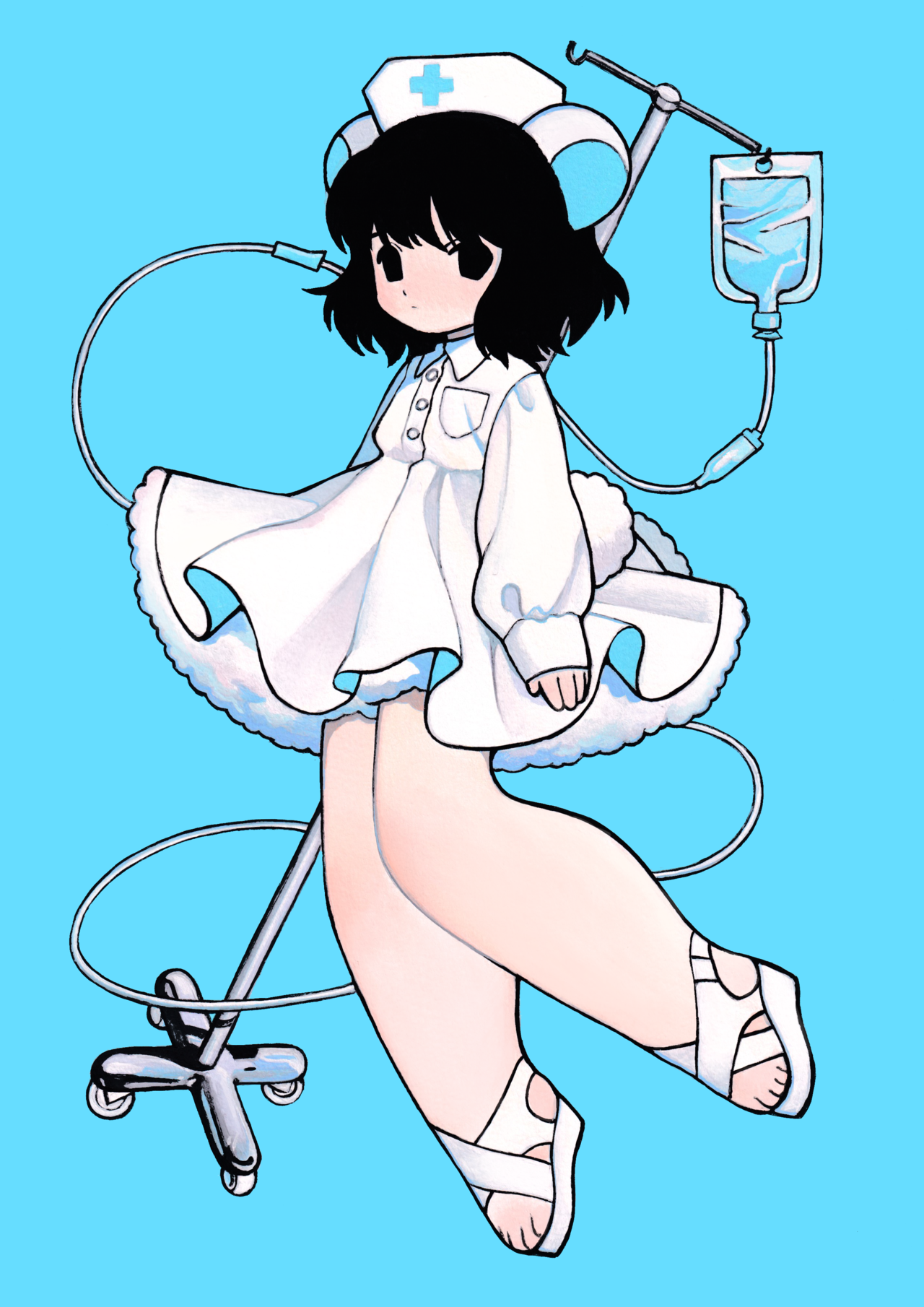 1girl animal_ears bear_ears bear_girl bear_tail black_eyes black_hair blue_background blue_theme commentary dress frilled_dress frills full_body hat highres intravenous_drip looking_at_viewer mino_(kirarayakubou) nurse nurse_cap original sandals short_hair simple_background untranslatable_commentary tail white_dress white_sandals