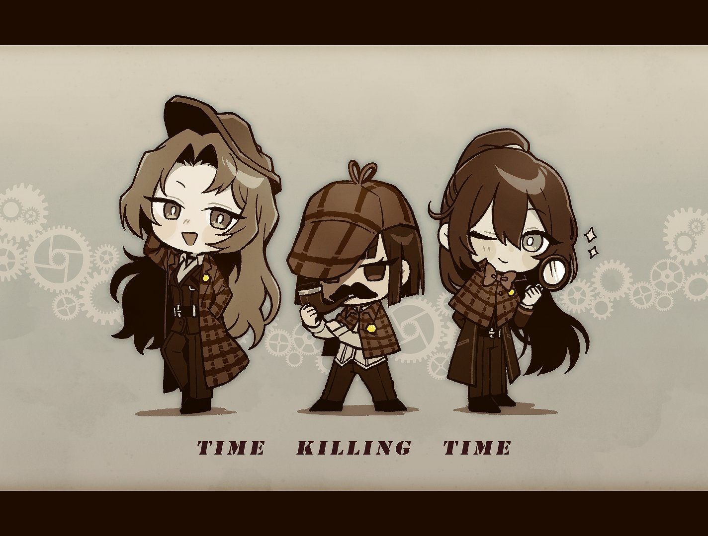 1boy 2girls bob_cut capelet closed_mouth coat deerstalker hat high_ponytail holding holding_magnifying_glass holding_smoking_pipe hong_lu_(project_moon) lapels limbus_company long_hair looking_at_viewer magnifying_glass multiple_girls notched_lapels one_eye_closed open_mouth pants parted_bangs plaid_capelet plaid_clothes plaid_coat ponytail project_moon rodion_(project_moon) ryoshu_(project_moon) sepia shirt smile smoking_pipe sparkle unitaroukun very_long_hair