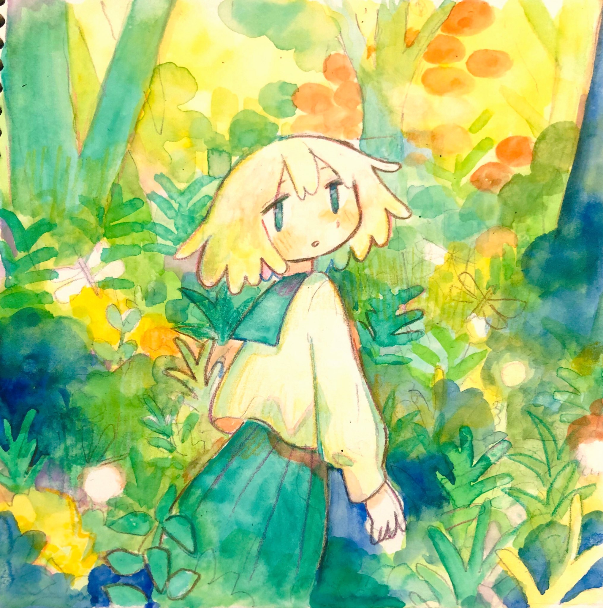 1girl bug colored_pencil_(medium) cowboy_shot dragonfly highres insect long_sleeves looking_at_viewer looking_back mamei_mema noko-chan_(mamei_mema) original outdoors painting_(medium) parted_lips plant pleated_skirt school_uniform serafuku shirt short_hair skirt solo standing traditional_media tree watercolor_(medium) white_hair white_shirt