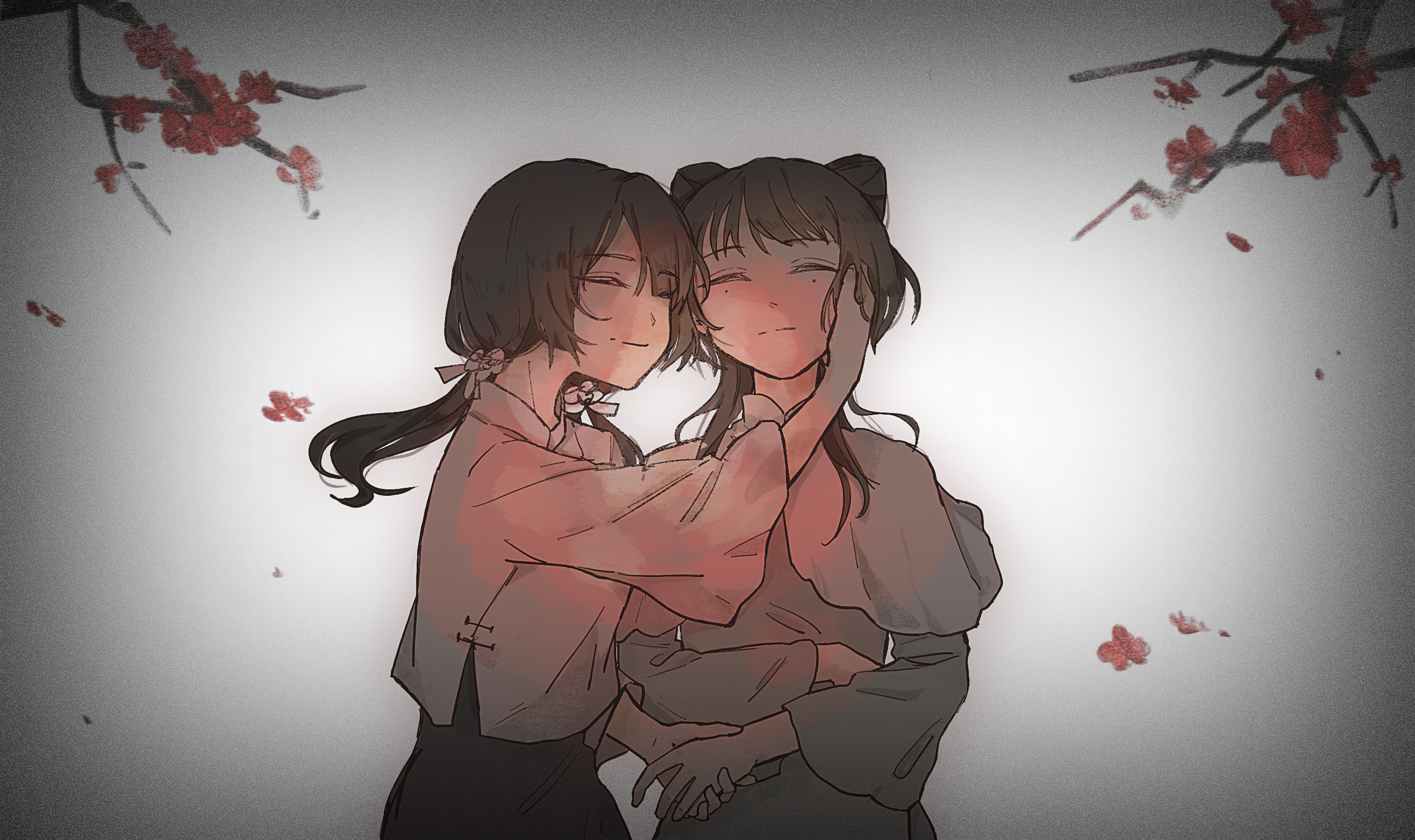 2girls black_dress black_hair branch capelet chinese_commentary closed_eyes closed_mouth commentary_request double_bun dress flower grey_dress hair_bun hair_flower hair_ornament hair_ribbon hand_on_another's_cheek hand_on_another's_face highres jacket liang_yanmei long_hair long_sleeves mole mole_under_each_eye mole_under_eye multiple_girls multiple_moles red_flower ribbon smile sot-rango touqi_guaitan unknown_friend_(touqi_guaitan) white_background white_capelet white_flower white_jacket white_ribbon