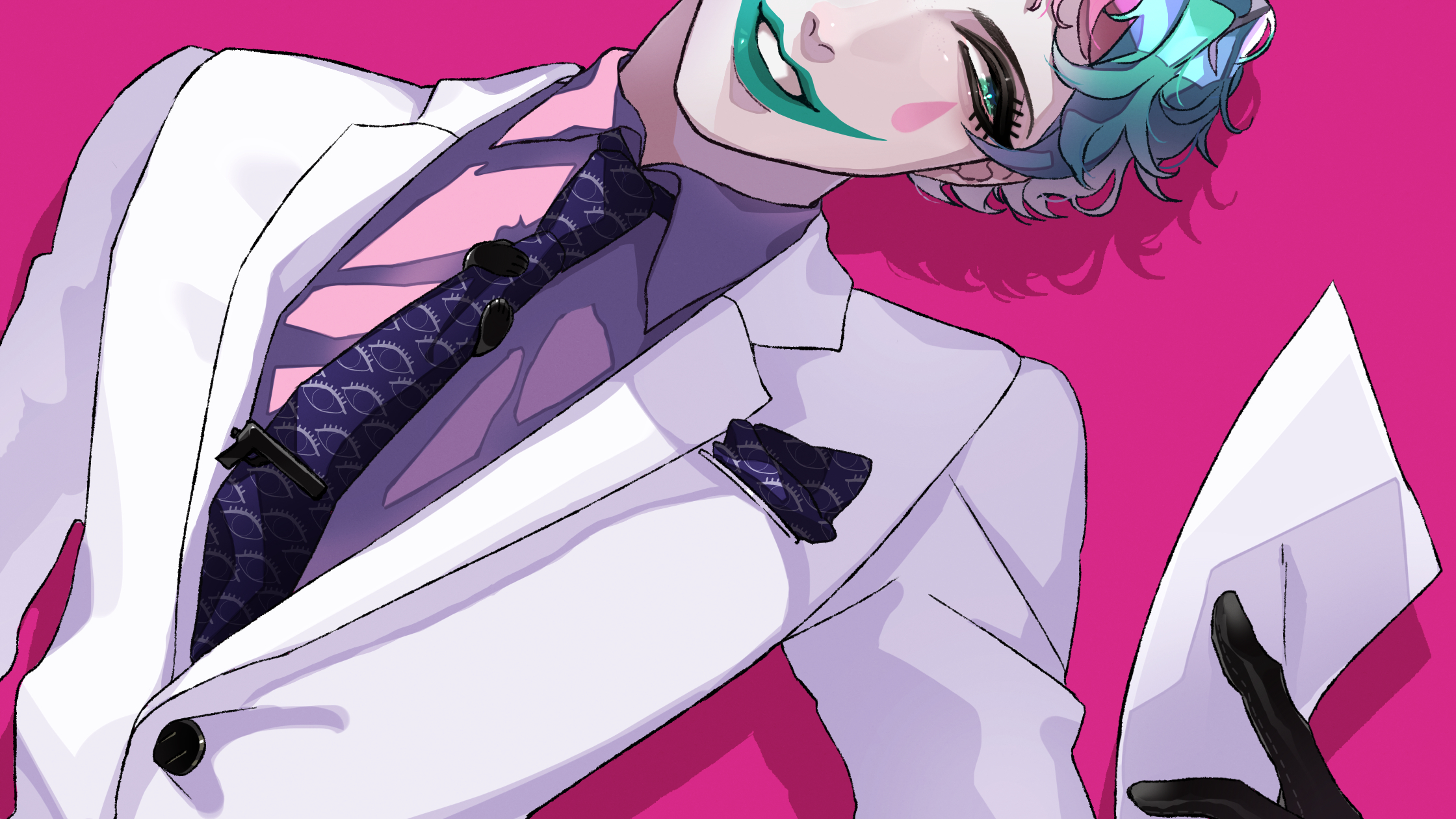 1boy aqua_hair aqua_lips black_gloves blue_hair breast_pocket buttons collared_shirt commentary_request facial_mark formal_clothes gloves hand_up highres holding holding_paper jacket joe_rikiichi joe_rikiichi_(1st_costume) lapels long_sleeves male_focus multicolored_hair necktie nijisanji paper parted_lips pink_background pink_hair pink_shirt pocket pocket_square print_necktie purple_necktie sazanamiryo shadow shirt sideways_glance simple_background smile solo suit teardrop_facial_mark teeth tie_clip upper_body virtual_youtuber white_jacket wing_collar