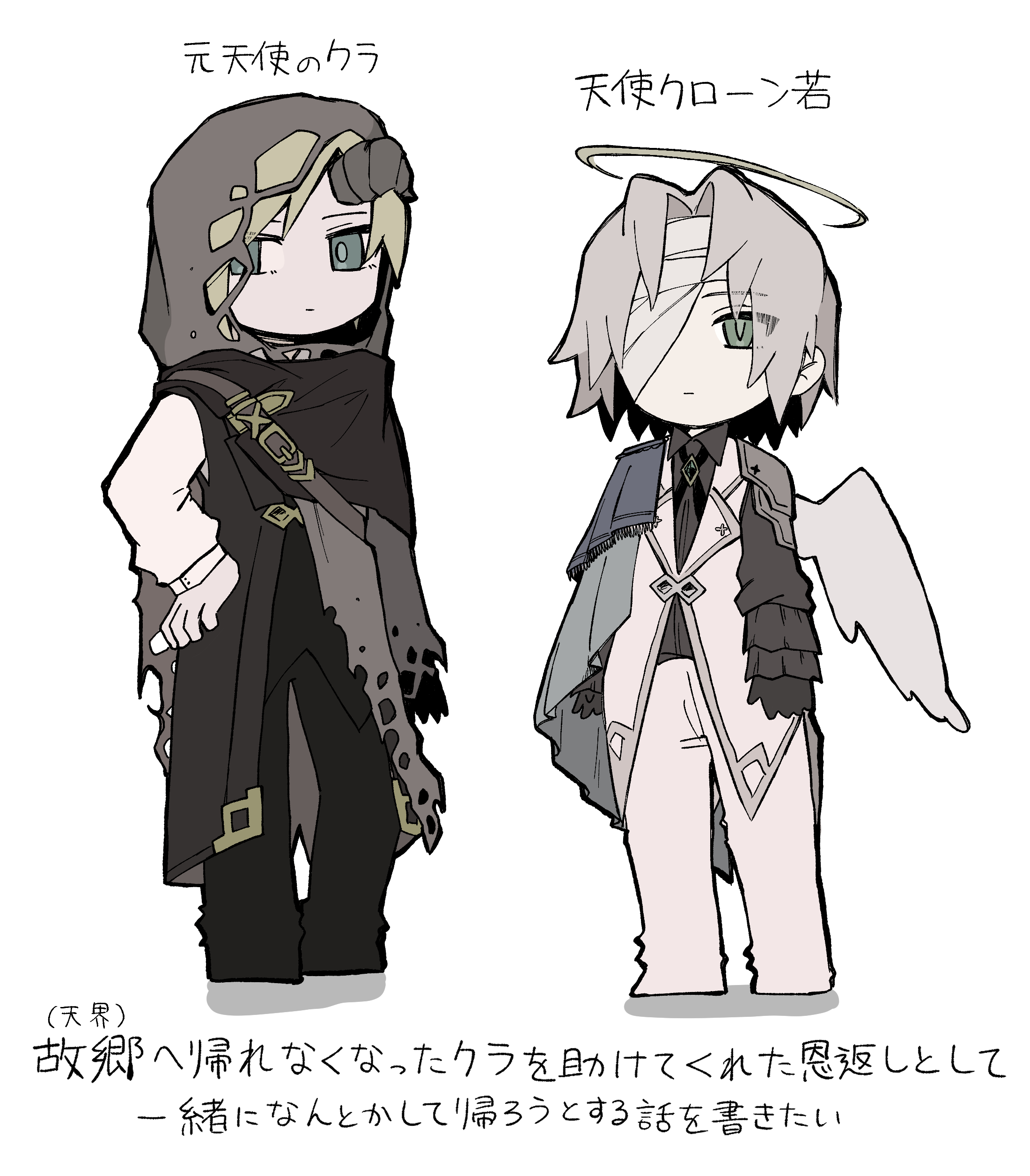 2boys absurdres aged_down alternate_costume alternate_universe angel_wings bandage_over_one_eye bandages belt black_pants blonde_hair bolo_tie cape chibi chibi_only cloud_strife commentary_request expressionless final_fantasy final_fantasy_vii final_fantasy_vii:_ever_crisis formal_clothes frilled_sleeves frills green_eyes grey_hair halo highres horns kawa_2929_ff multiple_boys pants sephiroth sephiroth_(ever_crisis) short_hair single_horn single_shoulder_pad single_wing standing suit torn_cape torn_clothes translation_request white_background white_pants wings