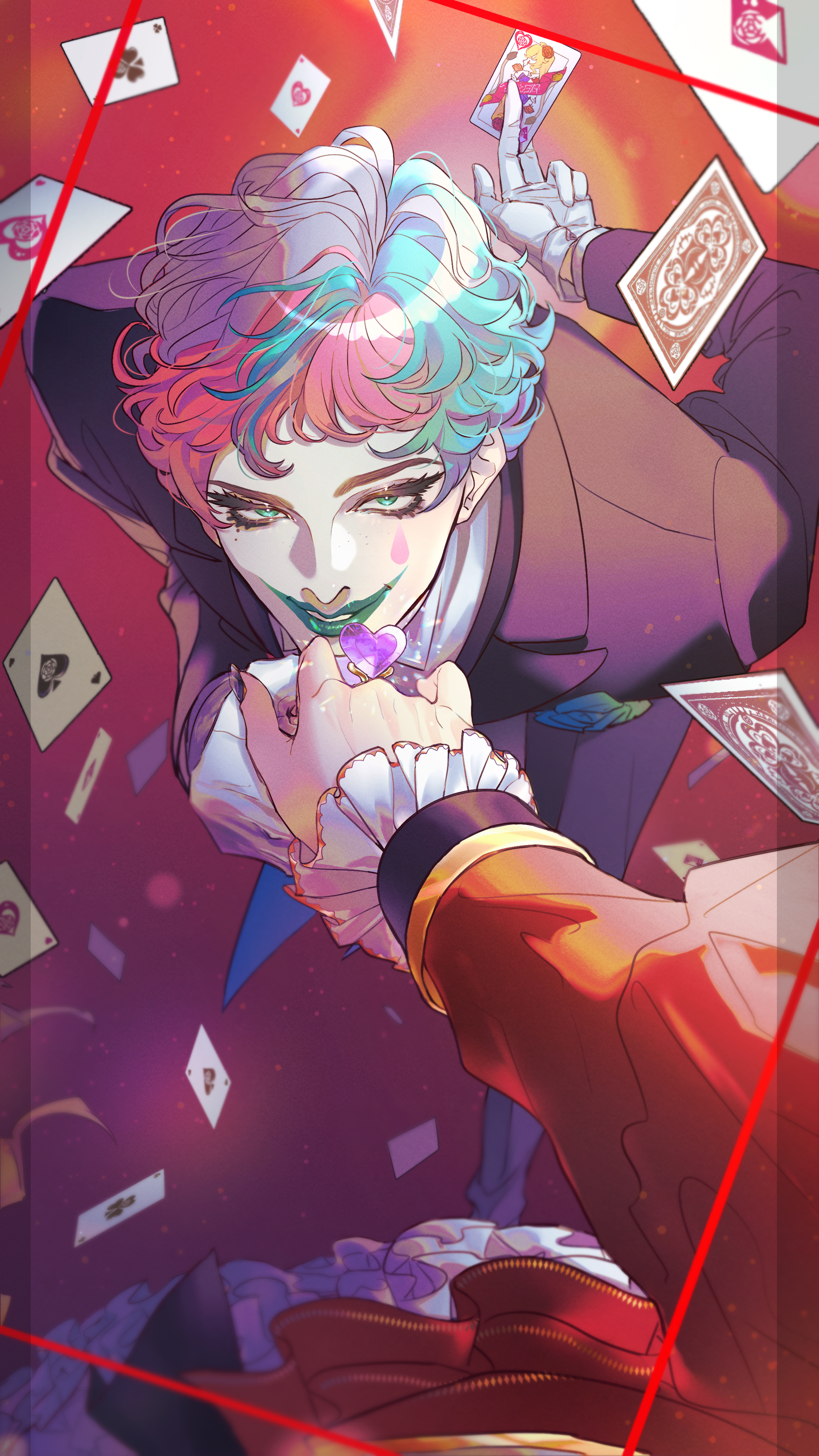 1boy 1girl absurdres ace_(playing_card) ace_of_clubs ace_of_diamonds ace_of_hearts ace_of_spades aqua_eyes aqua_hair aqua_lips arm_behind_back black_jacket black_nails black_pants card club_(shape) commentary_request confetti diamond_(shape) facial_mark fingernails floating_card frilled_sleeves frills from_above gem gloves hand_up heart heart-shaped_gem highres holding holding_card jacket jewelry joe_rikiichi lapels leaning_forward light_particles long_sleeves looking_at_viewer looking_up male_focus mole mole_under_eye multicolored_hair nail_polish nijisanji pants parted_lips pink_hair playing_card pov purple_gem purple_hair ring rokumeikan_kiriko sazanamiryo shirt short_hair smile solo_focus spade_(shape) teardrop_facial_mark virtual_youtuber white_gloves white_shirt