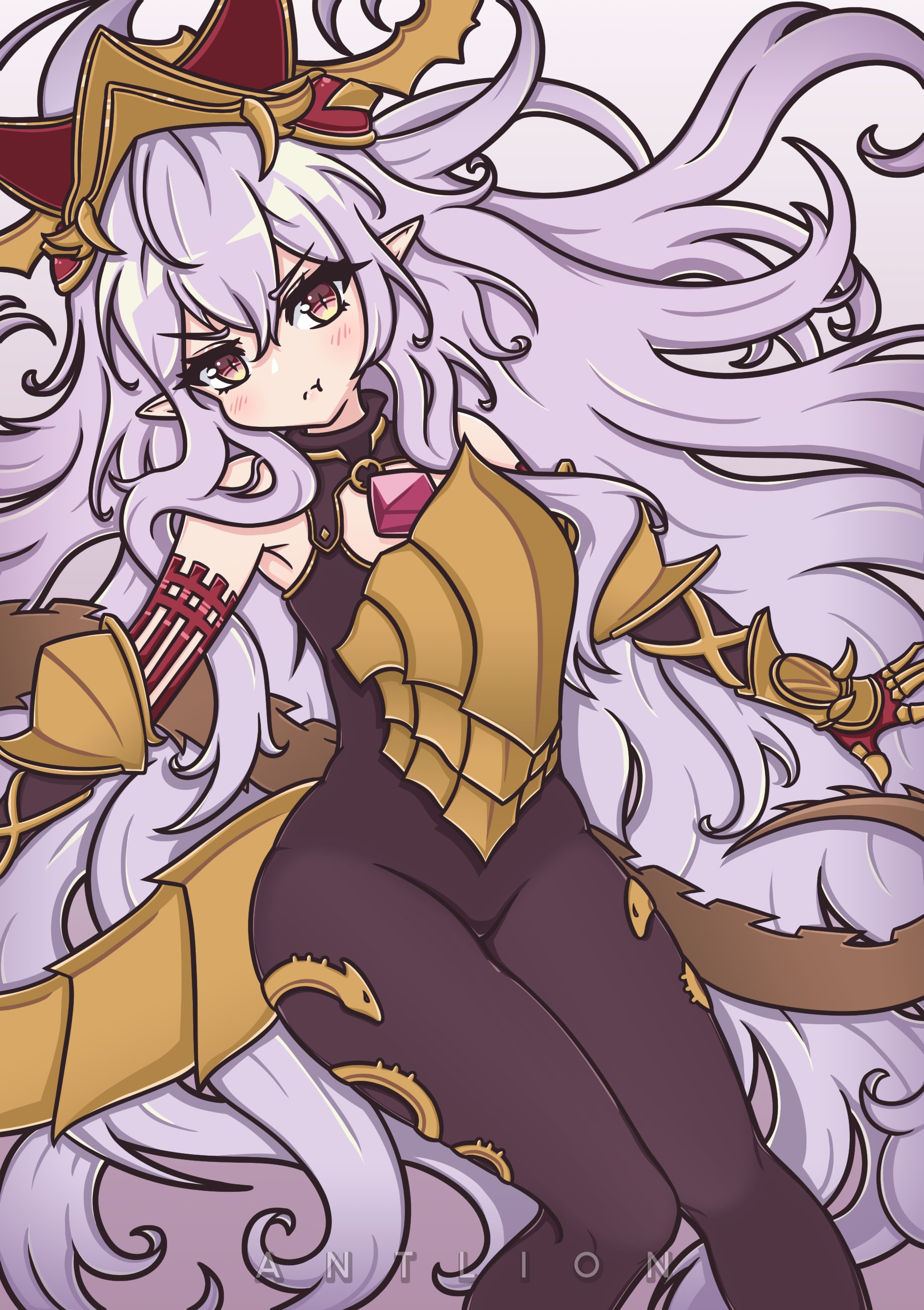 1girl absurdres ant_(db_antlion) armor bare_shoulders black_bodysuit bodysuit breastplate elbow_gloves gauntlets gloves granblue_fantasy hair_spread_out headpiece highres long_hair medusa_(shingeki_no_bahamut) pointy_ears pout red_gloves shingeki_no_bahamut solo tail v-shaped_eyebrows very_long_hair