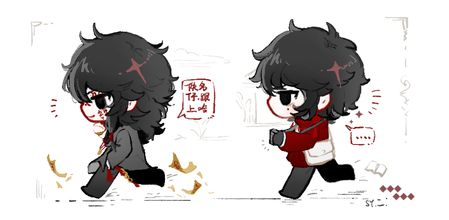 ... 2boys bag black_eyes black_gloves black_hair black_jacket black_pants chibi chibi_only chinese_commentary chinese_text closed_mouth commentary_request facial_tattoo gloves jacket li_yuting_(male) long_hair long_sleeves male_focus messenger_bag mole mole_under_eye multiple_boys ofuda pants red_jacket short_hair shoulder_bag smile soyuii spoken_ellipsis tattoo touqi_guaitan translation_request walking white_background white_bag ziche_fuzhao