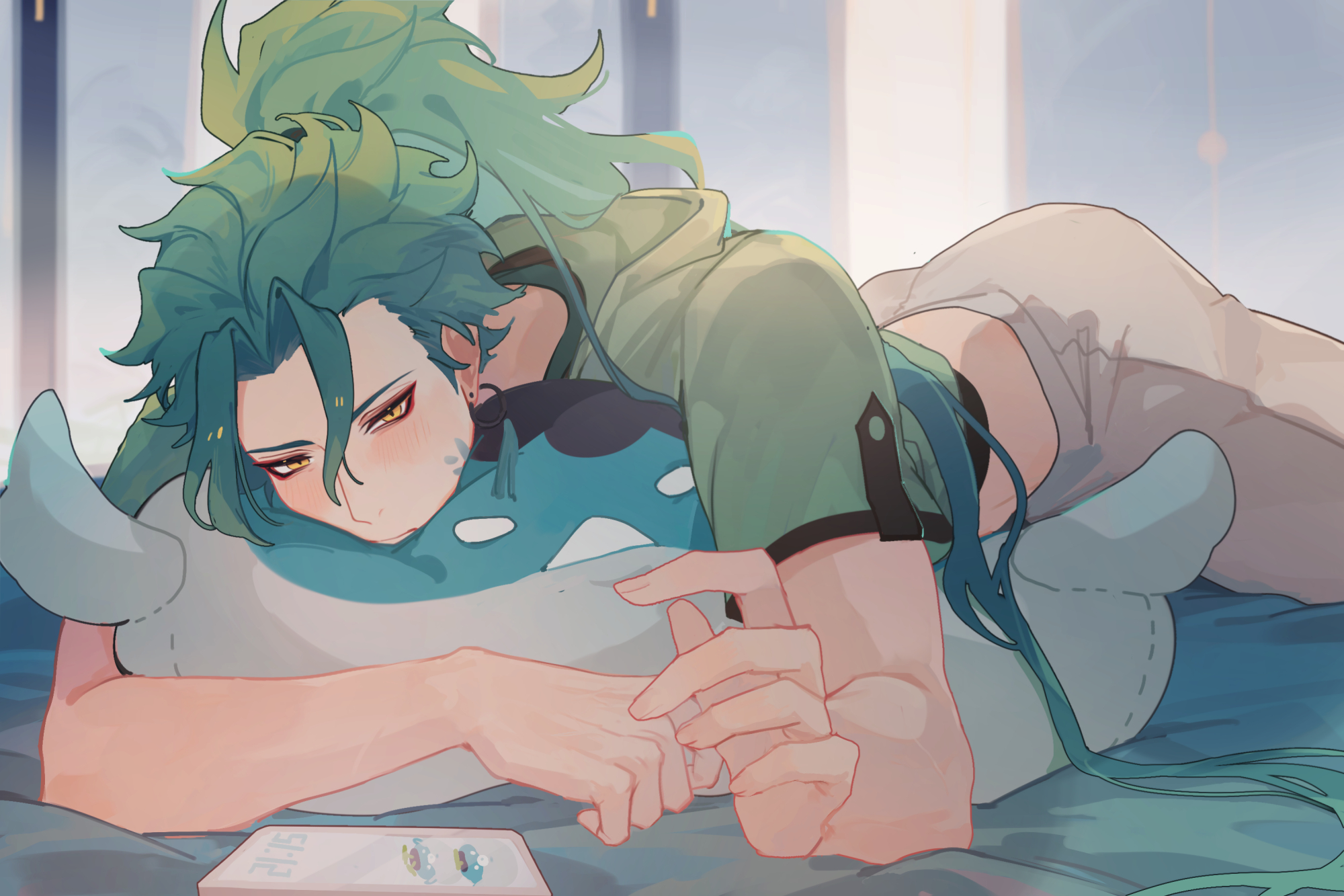 1boy chinese_commentary closed_mouth commentary_request elims eyeliner green_hair green_jacket hand_up highres hood hood_down hooded_jacket hugging_object ipad jacket jiyan_(wuthering_waves) long_hair looking_at_object lying makeup male_focus midriff_peek on_bed on_stomach pants pillow pillow_hug ponytail red_eyeliner scales solo tablet_pc white_pants wuthering_waves yellow_eyes