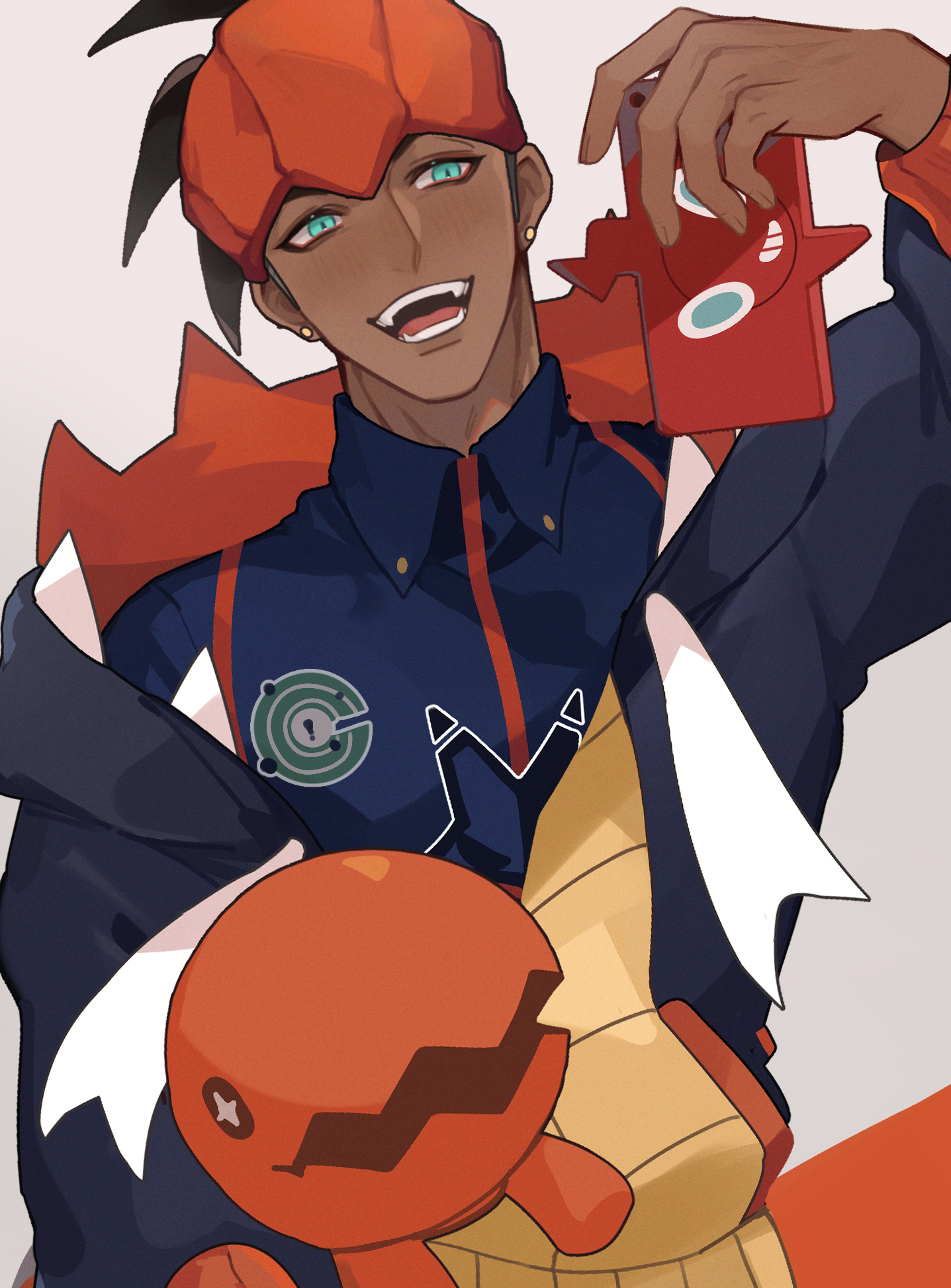 1boy aqua_eyes arm_up black_hair carrying chinese_commentary collared_shirt colored_skin commentary curled_fingers dark-skinned_male dark_skin drawstring ear_piercing earrings elims fangs gen_3_pokemon gen_4_pokemon headband highres hood hood_down hoodie jewelry long_sleeves looking_at_phone male_focus multicolored_hoodie multicolored_shirt nintendo open_mouth orange_headband orange_skin phone piercing pokemon pokemon_sword_and_shield raihan_(pokemon) rotom rotom_phone selfie shirt simple_background sleeve_cuffs solo star-shaped_pupils star_(symbol) striped_clothes striped_shirt stud_earrings symbol-shaped_pupils teeth tongue trapinch two-sided_hoodie upper_body vertical-striped_clothes vertical-striped_shirt white_background wing_collar