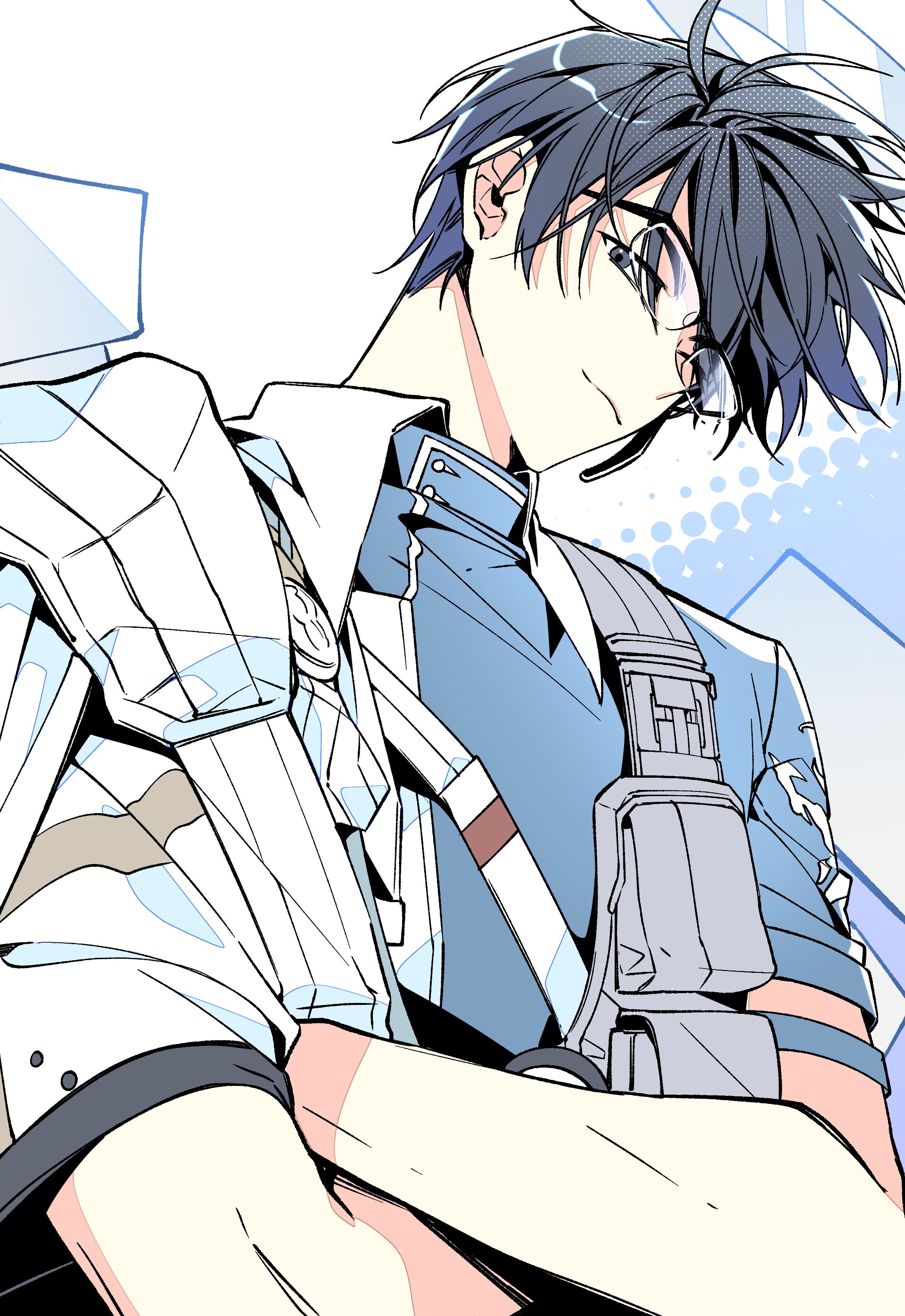 1boy absurdres arknights asymmetrical_clothes bandolier belt black_hair blue_eyes blue_shirt cape chest_belt closed_mouth collared_shirt commentary_request crossed_arms glasses hair_between_eyes halftone halo highres insider_(arknights) korean_commentary looking_at_viewer male_focus pouch rimless_eyewear shirt short_sleeves side_cape smile solo uiiiiiiiing upper_body white_belt white_cape