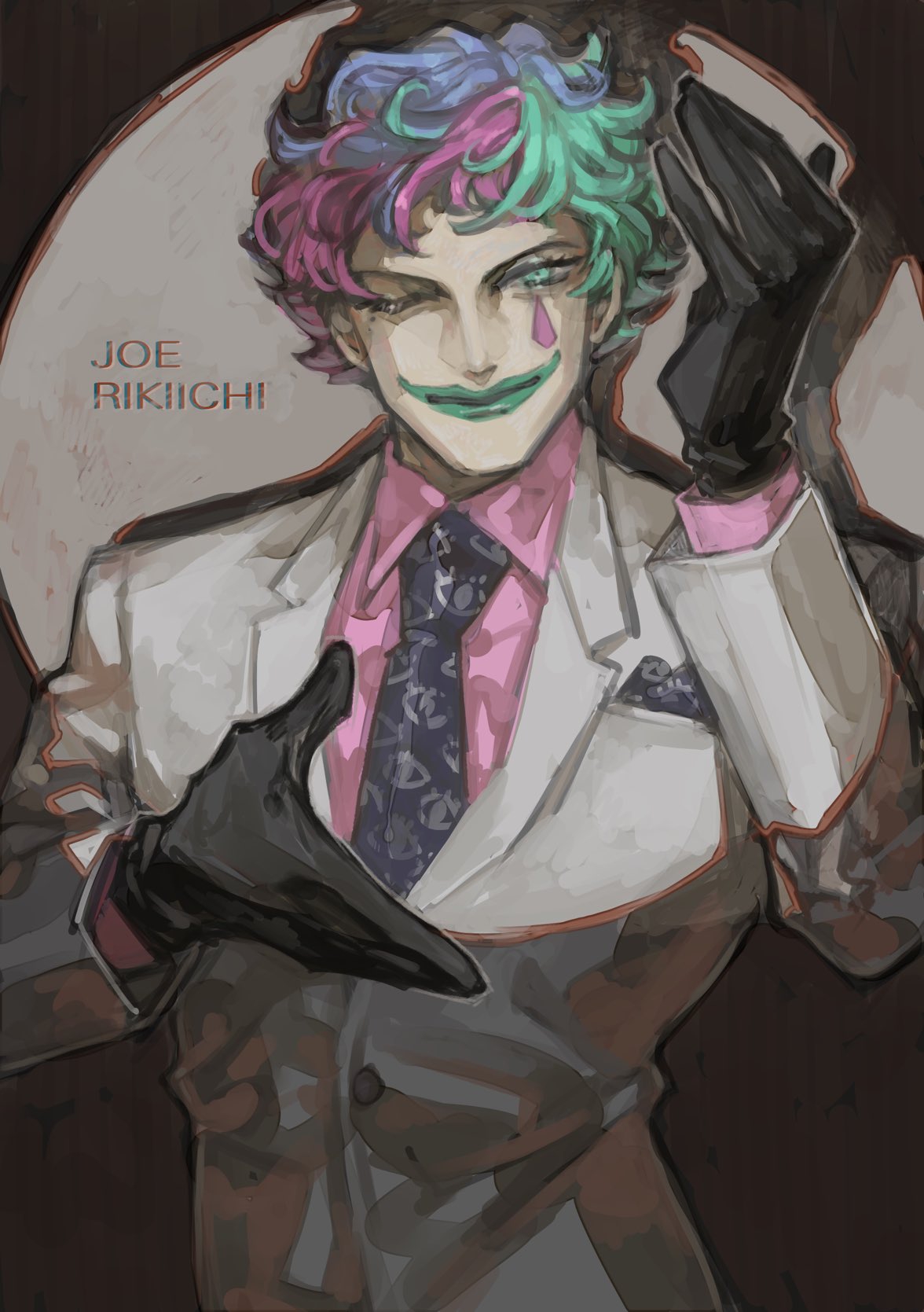 1boy aqua_eyes aqua_hair aqua_lips black_gloves closed_mouth collared_shirt commentary_request facial_mark gloves hands_up highres jacket joe_rikiichi joe_rikiichi_(1st_costume) kan_(punsukapun) lapels long_sleeves looking_at_viewer male_focus mole mole_under_eye multicolored_hair necktie nijisanji one_eye_closed pink_hair pink_shirt pocket_square print_necktie purple_hair purple_necktie shadow shirt short_hair smile solo spotlight teardrop_facial_mark upper_body virtual_youtuber white_jacket wing_collar